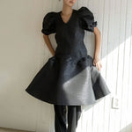 يبرز الياقة على شكل حرف V عظمة الترقوة ويخلق مظهرًا طويلًا وهوائيًا. على الرغم من كمية القماش الكبيرة المستخدمة، فإن الإحساس الخفيف والناعم يجعل هذه القطعة مريحة للغاية.