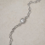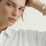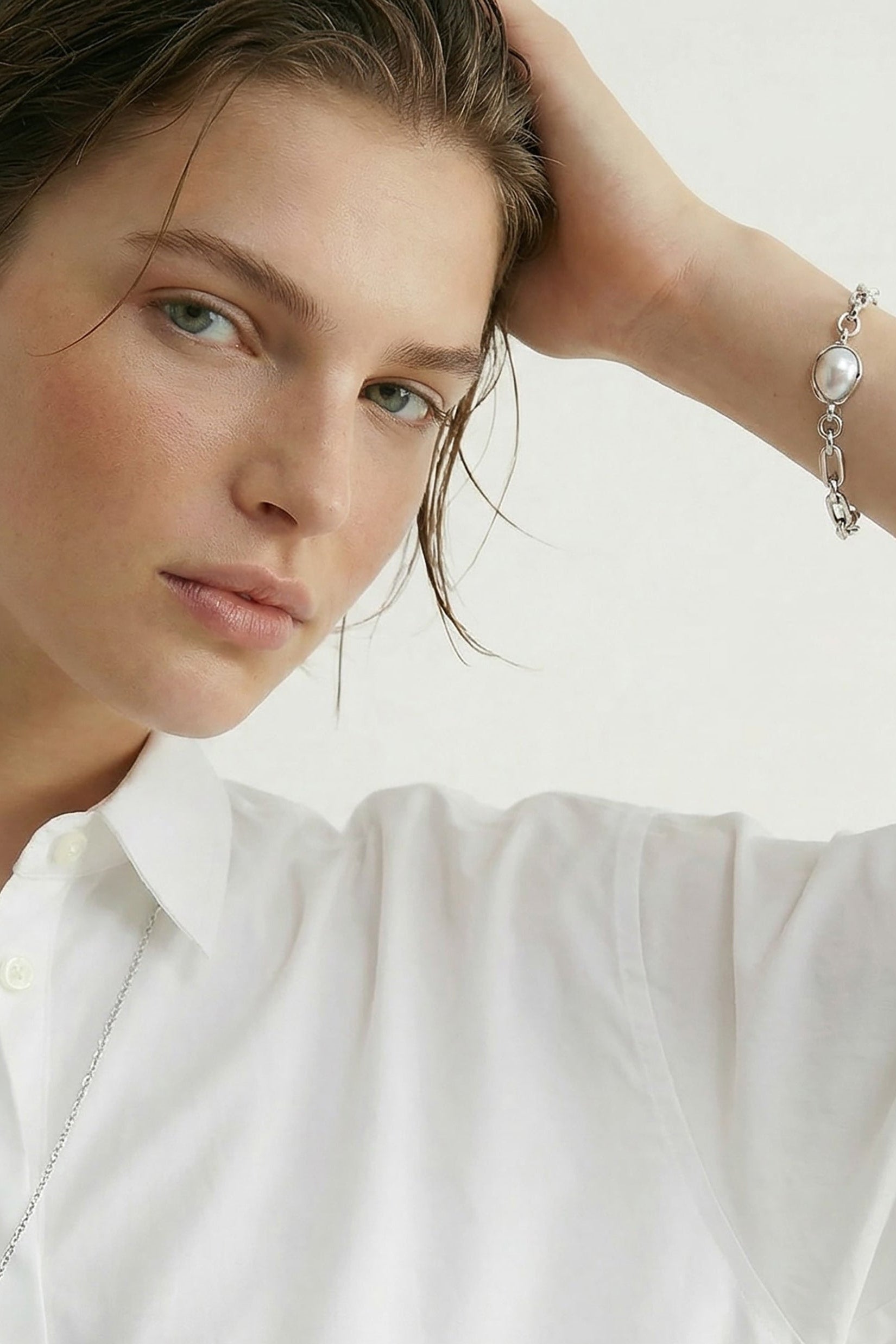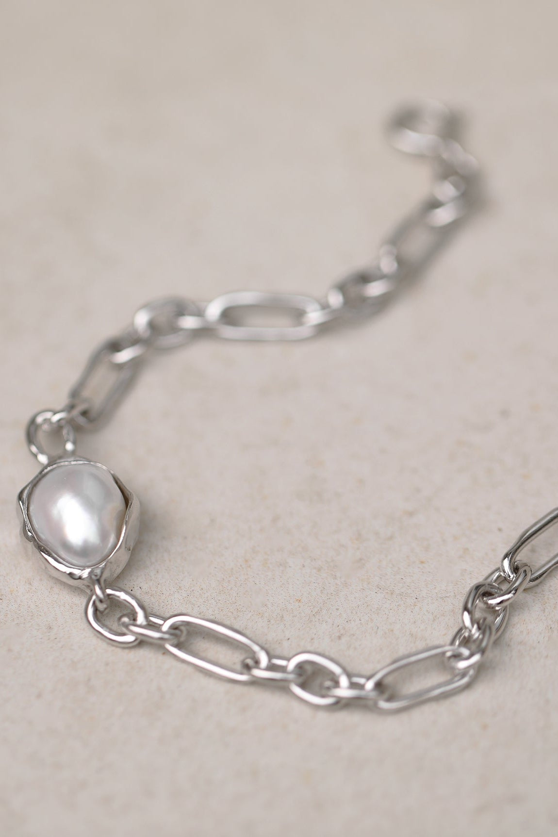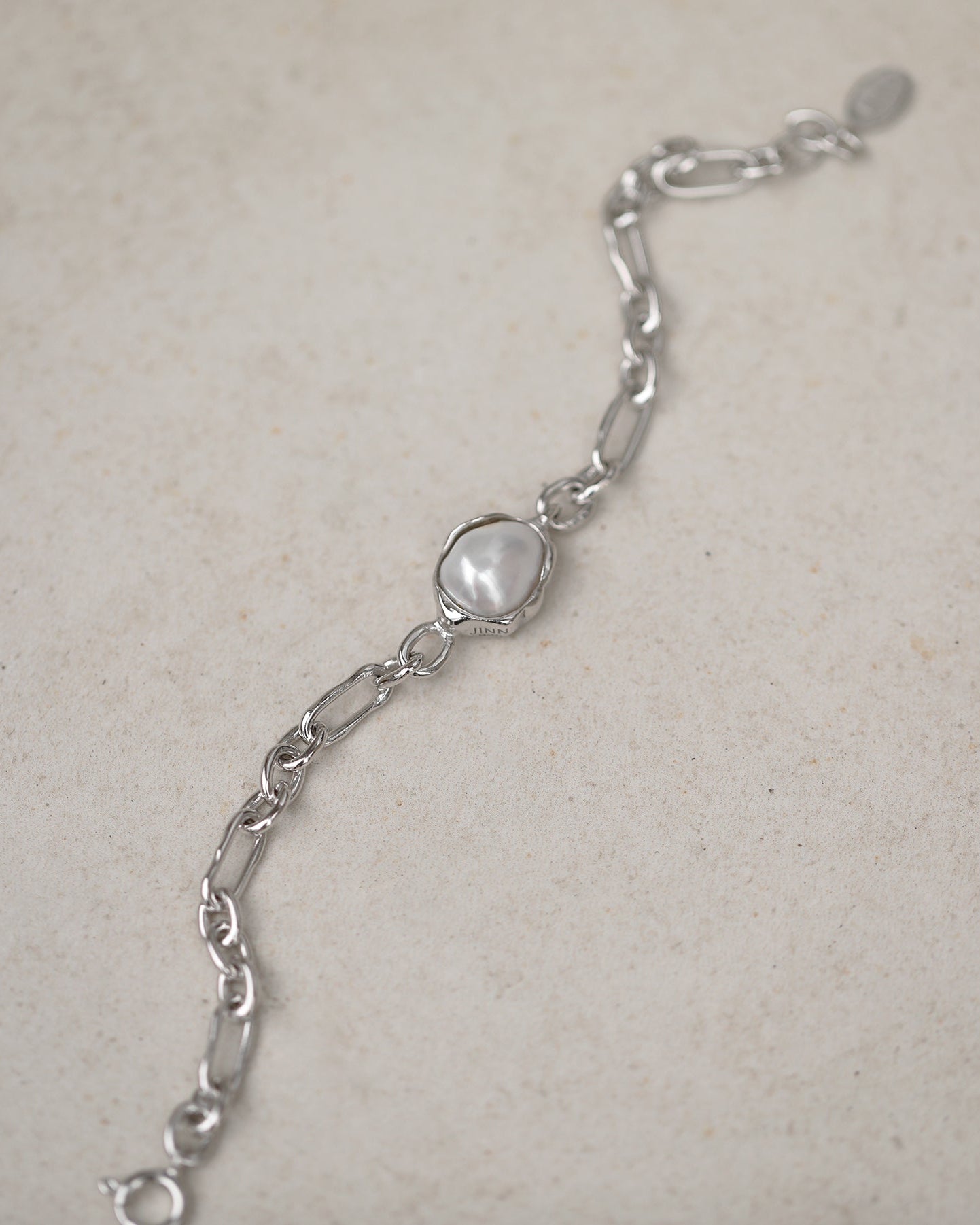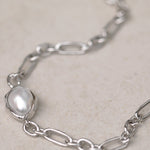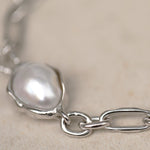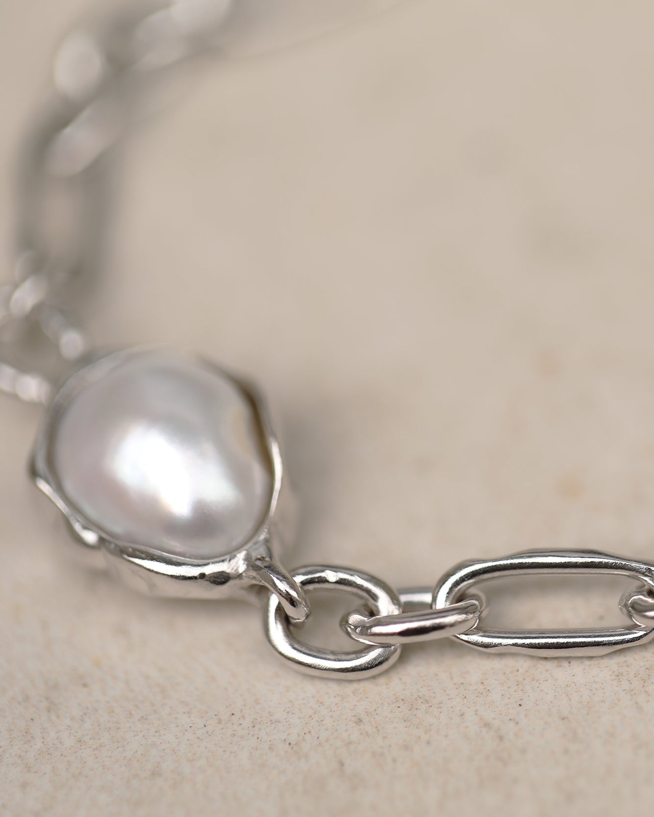 كل لؤلؤة فريدة من نوعها ومثبتة في إطار مصقول مصمم ليتبع طبيعتها الطبيعية. تتميز السلسلة بروابط بيضاوية غير منتظمة ذات ملمس عضوي، مصنوعة كأشكال صلبة لتوفير إحساس متين ومدروس—مما يضفي عمقًا ووزنًا وحضورًا مميزًا بهدوء على القطعة.