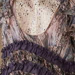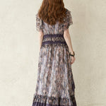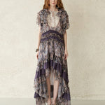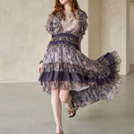 a purple silk dressLovely mood with colorful flared sleeves in multiple layersLeopard print on silk organza materialIt shapes the waistline and makes you look slim with a flare skirt design.