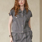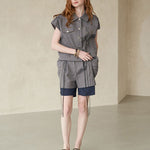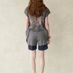 medium-blue shortsDrapped pocket points on both sidesa layered hem design that looks like a shirt coming outa long black trimming pointRecommended as a daily item that's good to wear lightly with various tops.