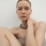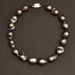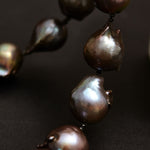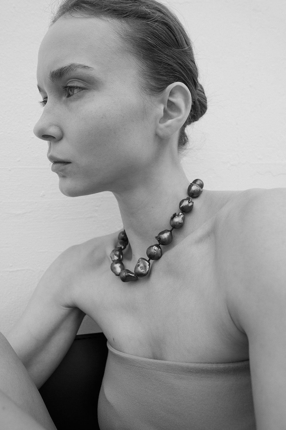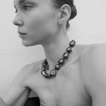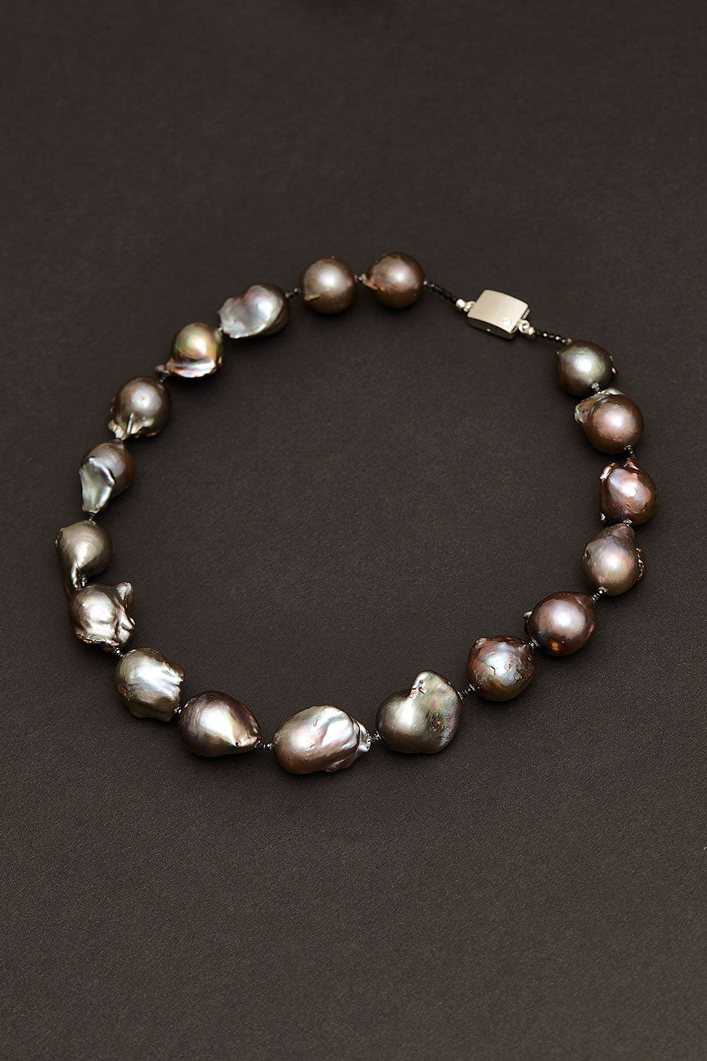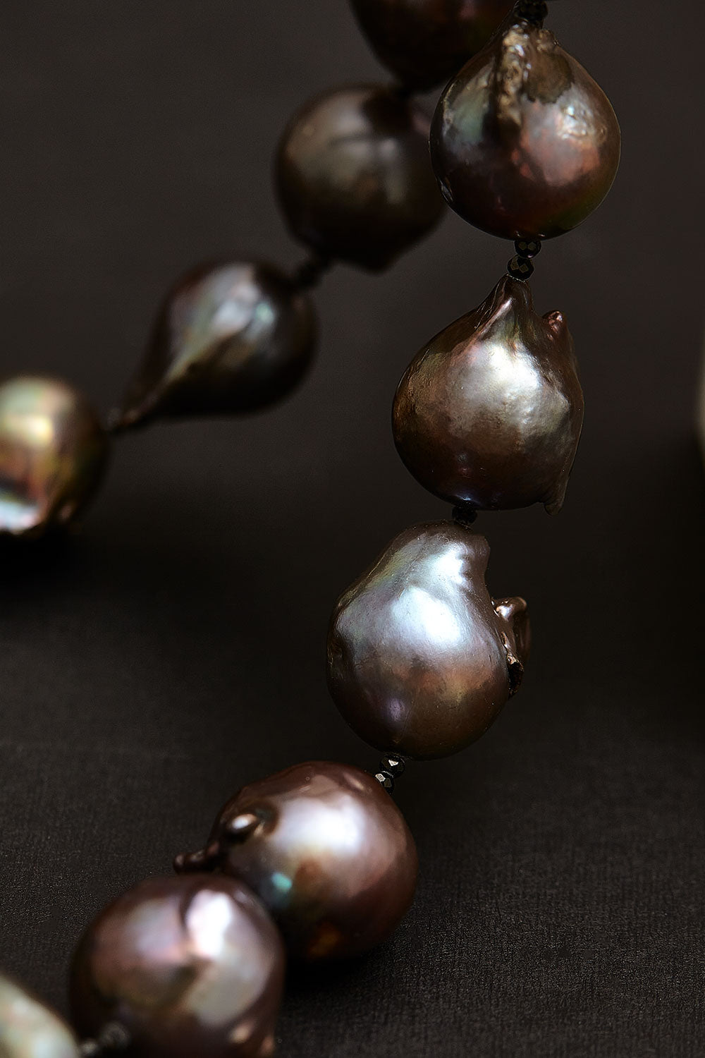 This necklace is crafted from baroque Tahitian black pearls sourced from the waters of Tahiti. Each pearl measures 15–18mm, and no two are exactly alike. Set in deep charcoal tones layered with bronze and green overtones, the pearls reveal a seductive depth of color found only in black pearls— an allure that is truly singular. The necklace rests naturally along the neckline and is finished with a minimal silver clasp. Not an ornament, but an attitude worn at the neck.