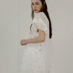 A silver metallic ribbon accents the panel connecting the top and bottom, highlighting the pin-tucked front, adding a touch of silver to the off-white look, creating a signature Bangté look.
