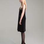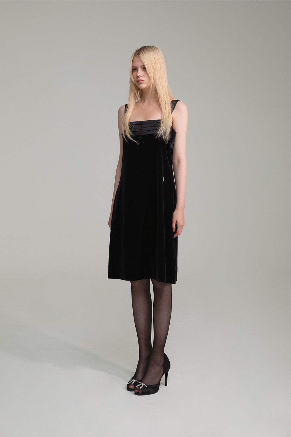 Pleated detailing at the upper bodice is accented with fabric-covered buttons for refined charm.