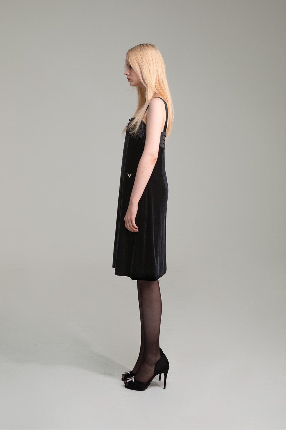 A sculpted, feminine pattern enhances the body line, finished with a crystal-embellished metal “V” logo.