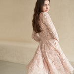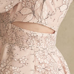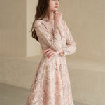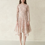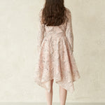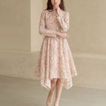 a pink lace dressIt shapes the waistline and makes you look slim with a flare skirt design.Don't worry about it being see-through by putting the lace on top of the pink fabric.Unbalanced length to create a colorful movement