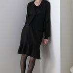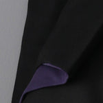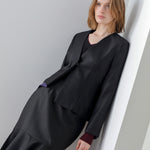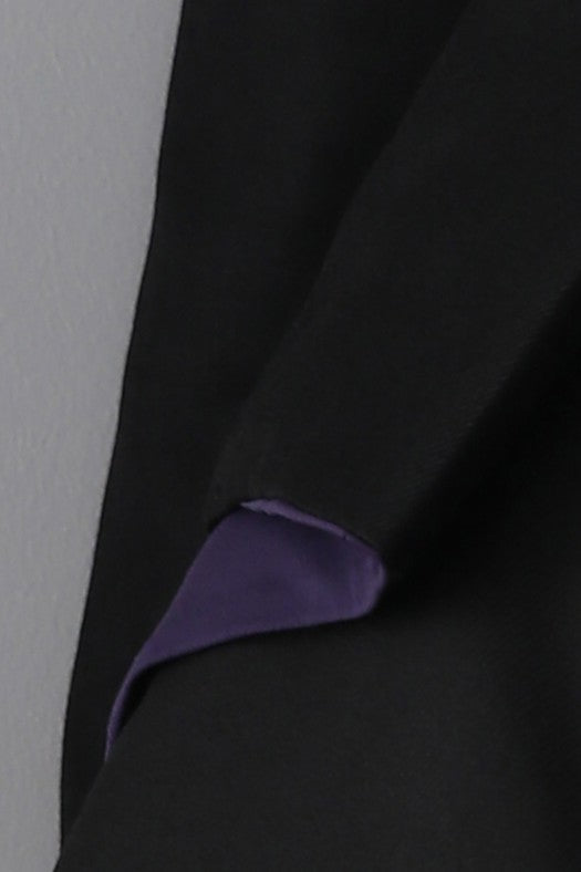 The softly flowing fabric naturally falls along the body line. The button fastening emphasizes the minimalist design and creates a simple silhouette. The simple black color with purple points creates a modern and unique mood.