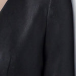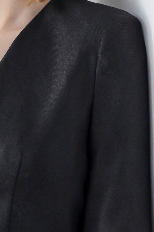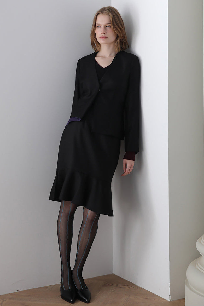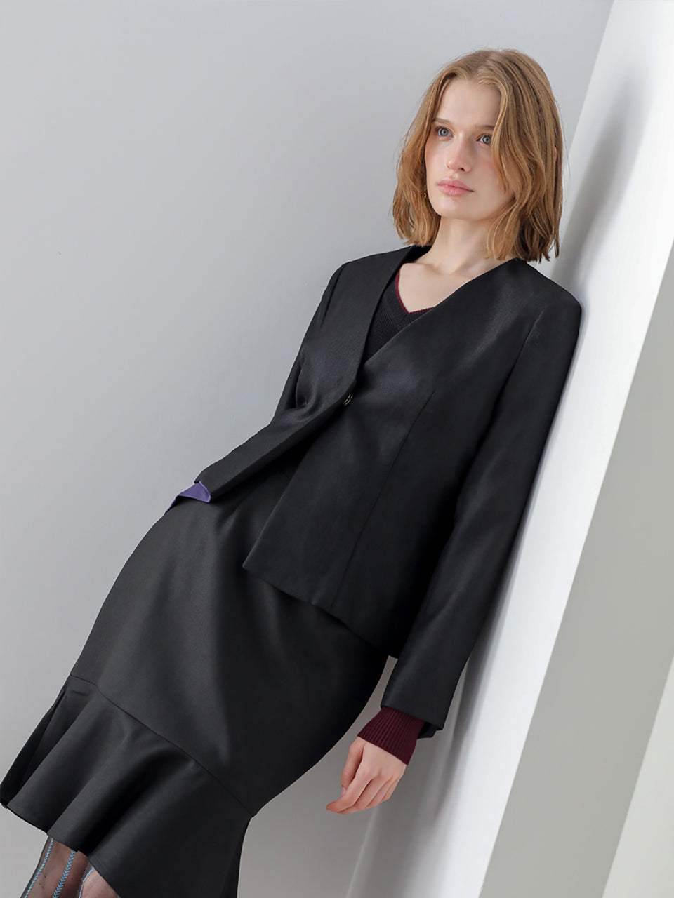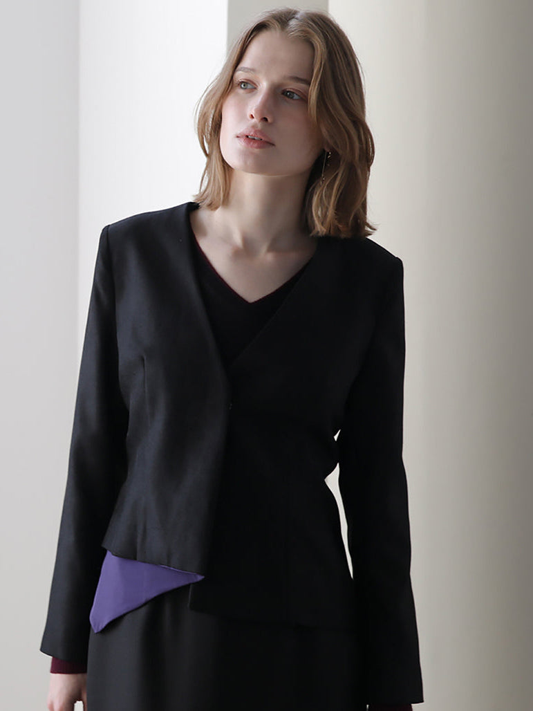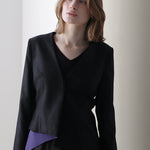 A jacket with a V-neckline that creates a neat and sophisticated silhouette. Purple color detailing on one side of the hem completes a sensual point.