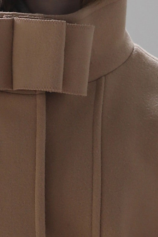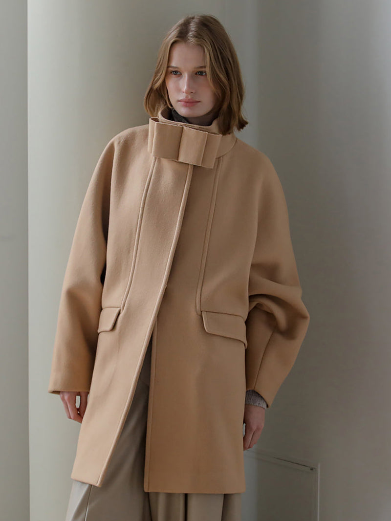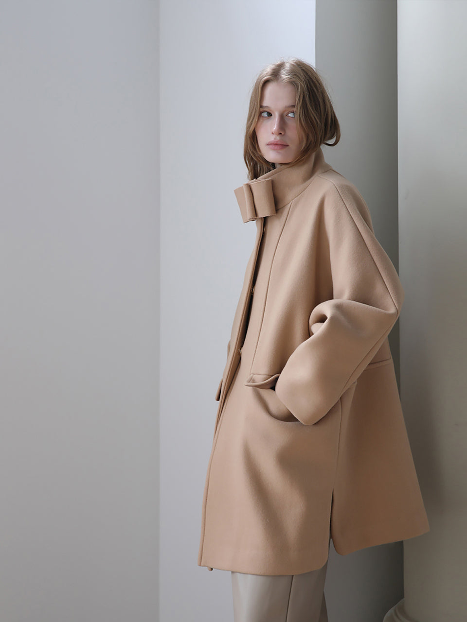 A bold high neck with big ribbon details creates a luxurious and structured silhouette. Soft and sturdy wool blend material provides a warm and smooth fit. The loose fit of the oversized silhouette naturally covers the body shape. The hidden button fastening emphasizes a minimal and sophisticated mood.