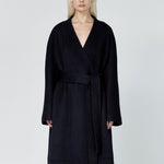 Dies ist ein kragenloser Mantel mit dreidimensionalen, rund fallenden Schultern und einer tiefen V-Ausschnittform. Strukturelle Nahtlinien-Details sind an der voluminösen Körpersilhouette hinzugefügt, und die lockere Passform sorgt für einen bequemen Sitz.