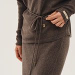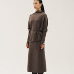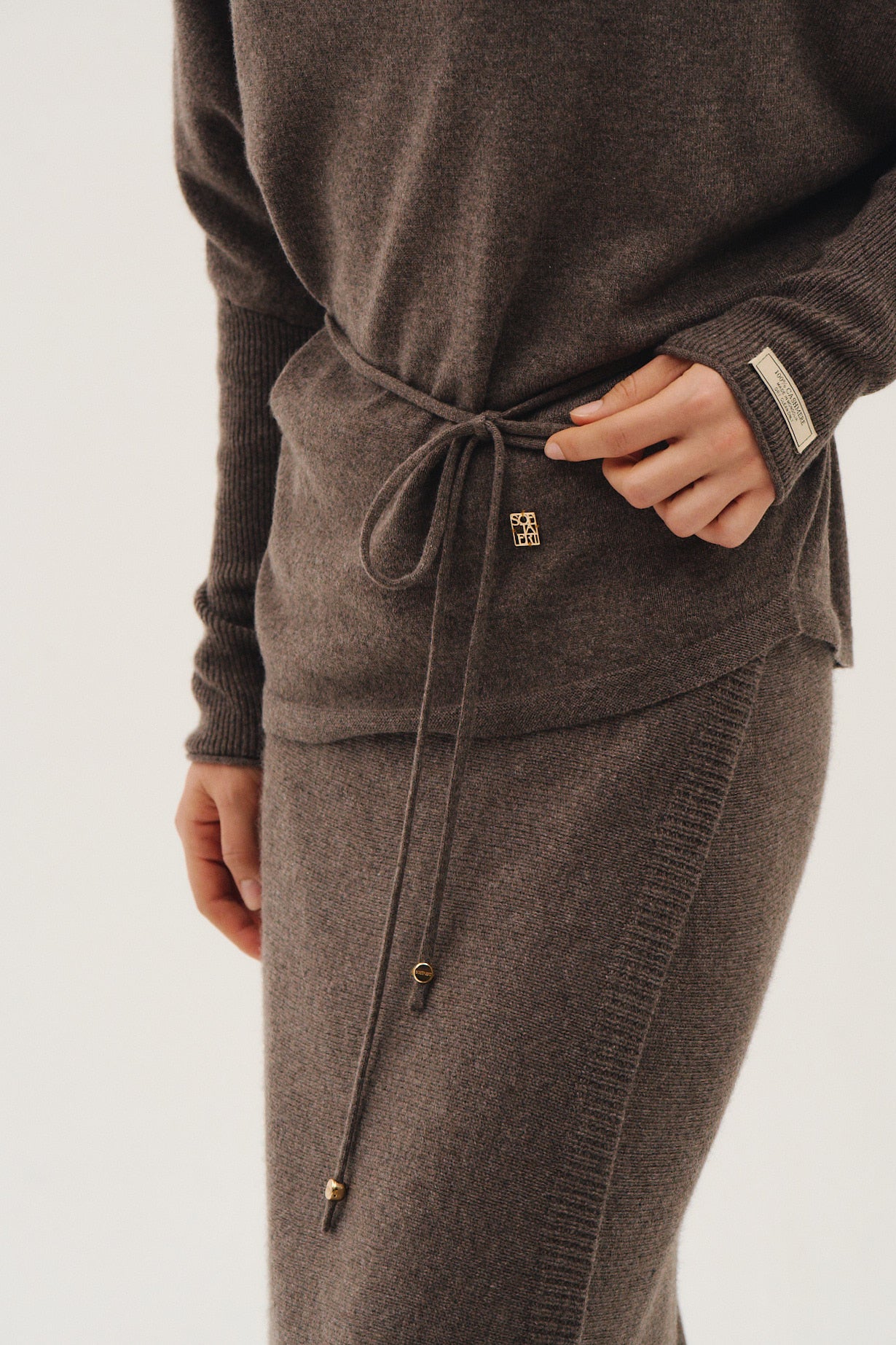 A gentle drop-shoulder silhouette is complemented by an adjustable waist string, finished in matching cashmere for subtle harmony.