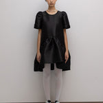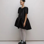 This dress, with its voluminous puff sleeves and splendid hemline, is a continuation of last season's silhouette.