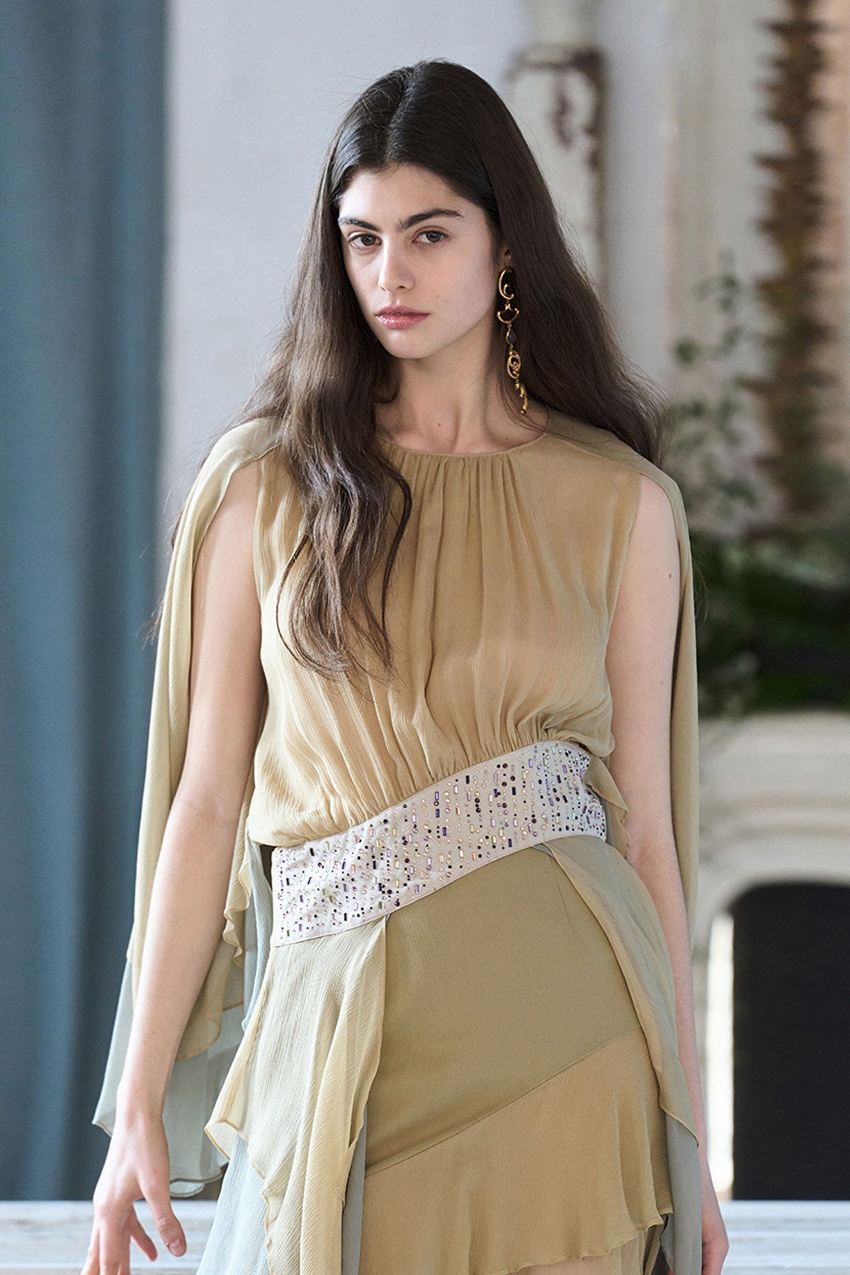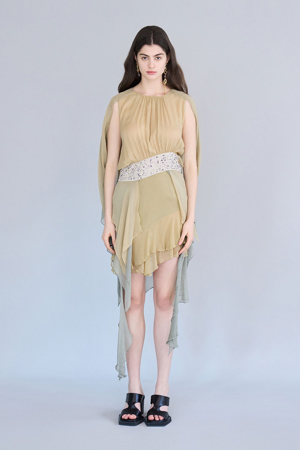 Cutout cape sleeve asymmetric silk blouse