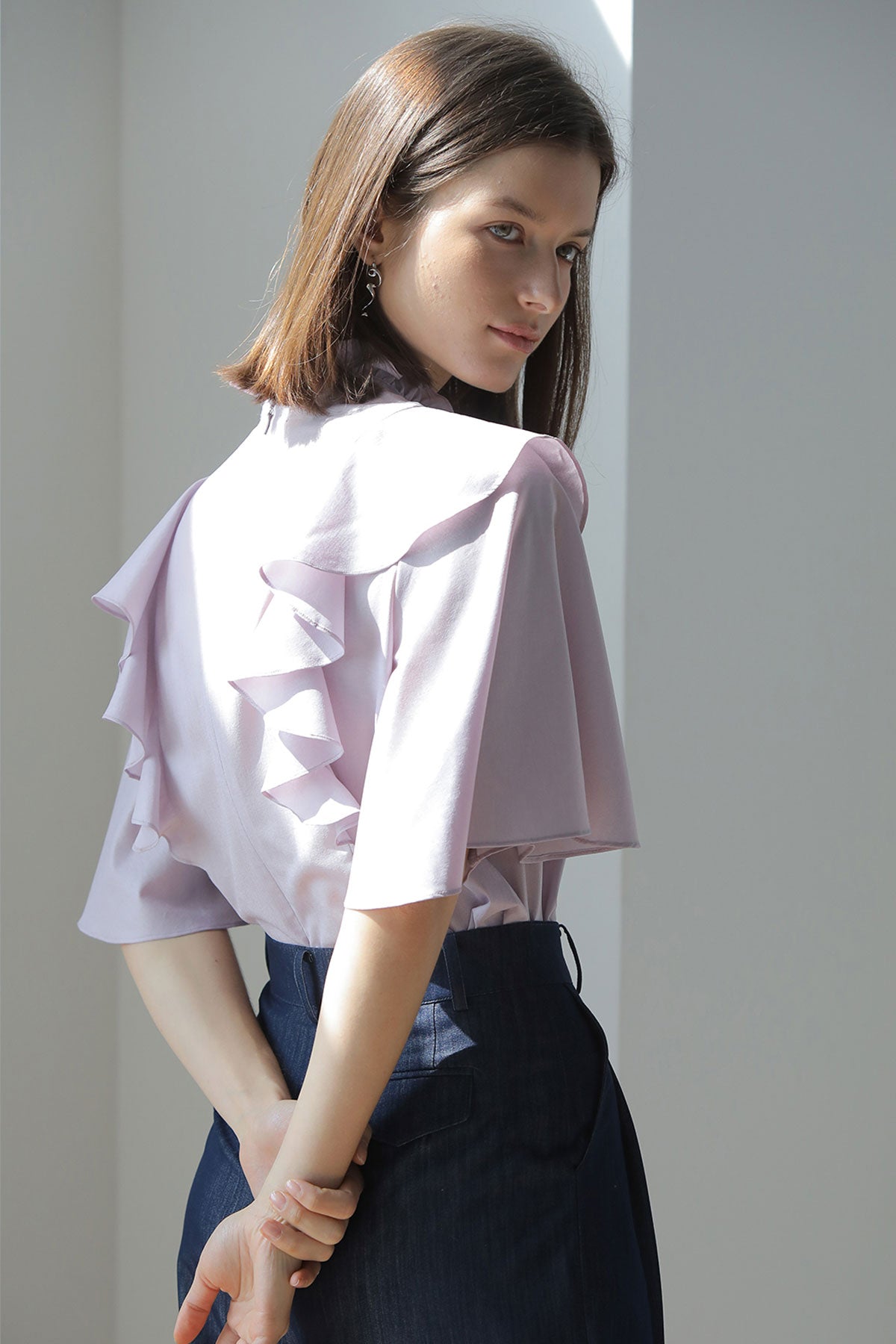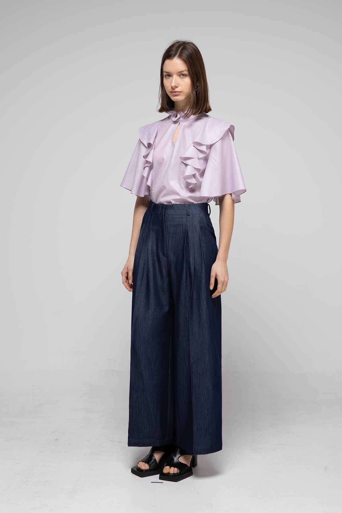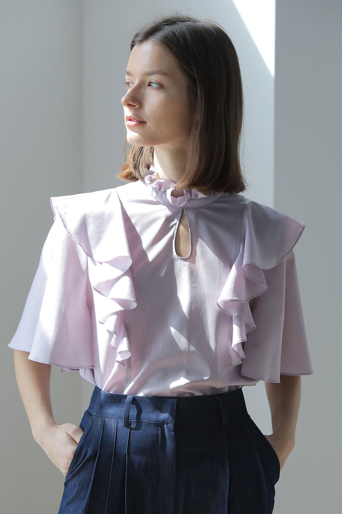 Loose fit key holder neckline ruffle blouse purple