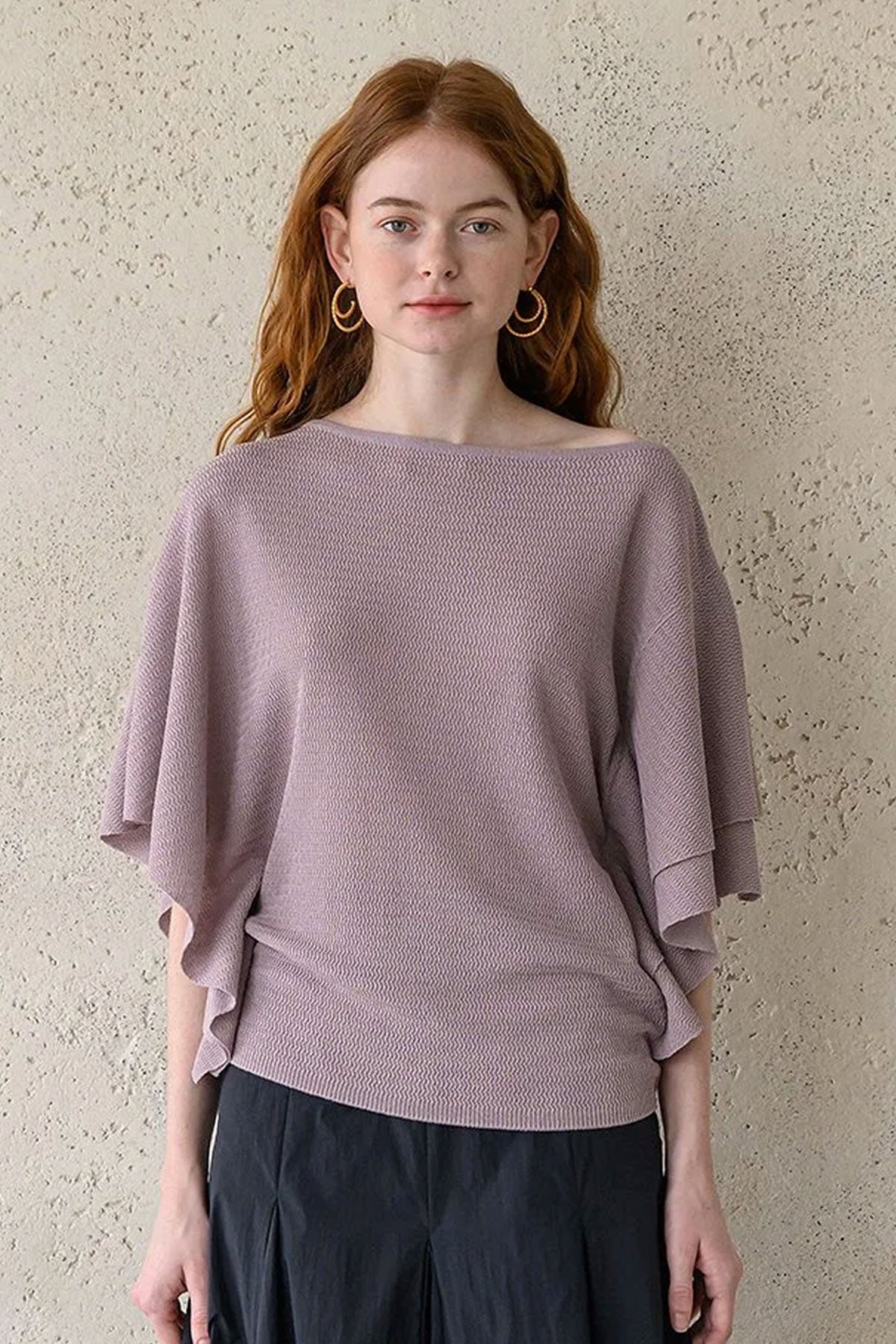 Light purple boat neck knitwear.