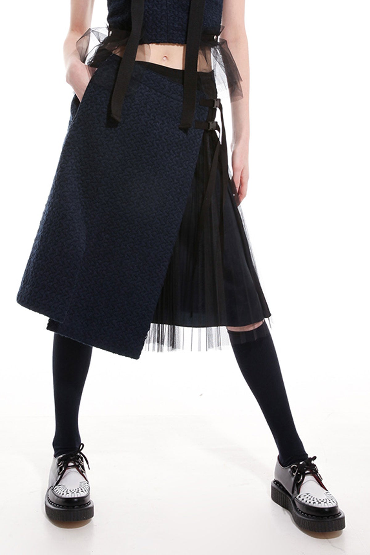 This is a knee-length wrap skirt with tweed material ordered from Italy as the main material, black tulle material, unique buckle details, slits, and piping details as the points.