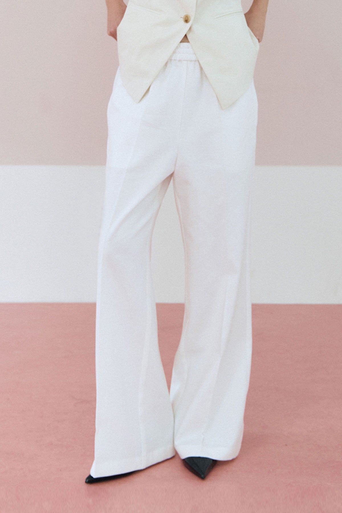 This item is made from an ivory-colored linen-cotton fabric that offers excellent breathability, giving it a cool and refreshing feel. Pressed pleats at the front and back center create the illusion of longer legs. With its long bootcut silhouette, this pair of pants is timeless and easy to style with a variety of items, making it a versatile piece for long-term wear. For added comfort, it features an elastic waistband, adjustable waist drawstrings, and practical side pockets.