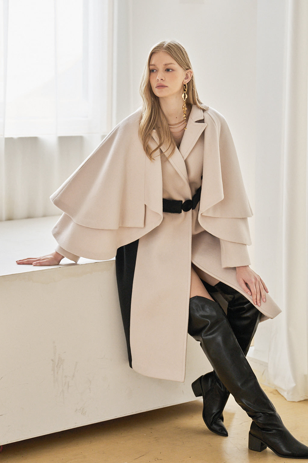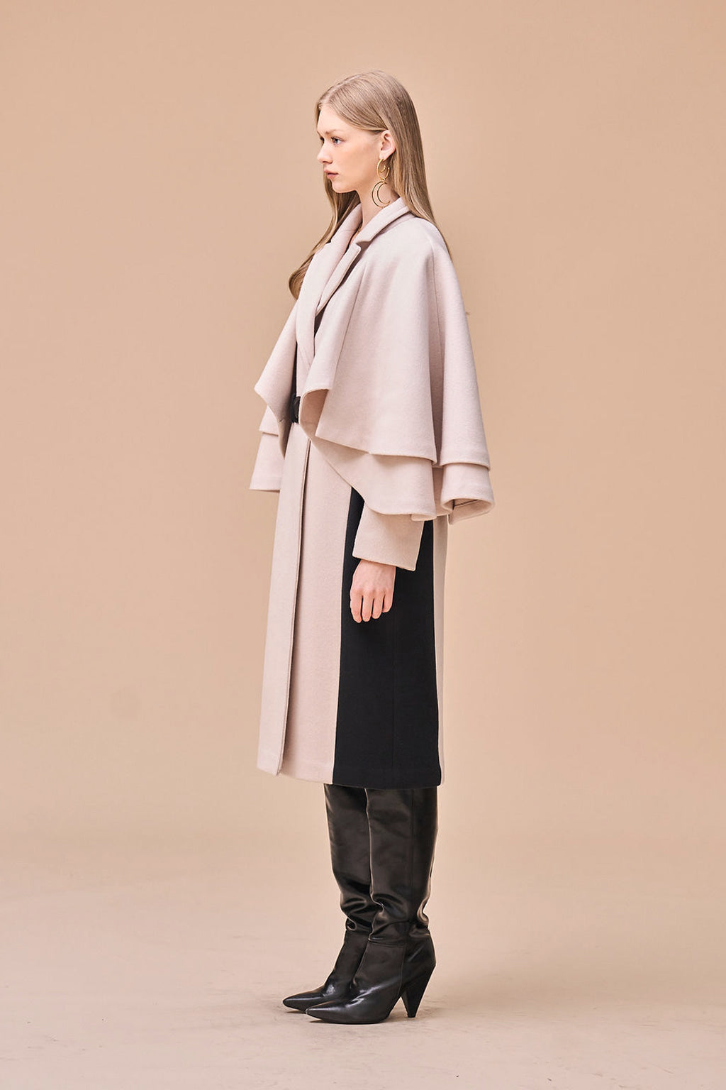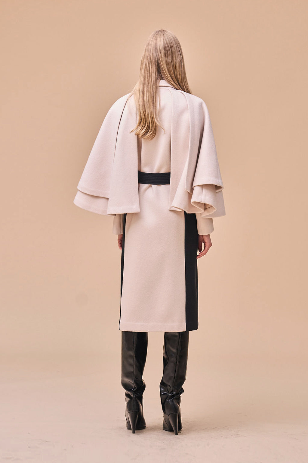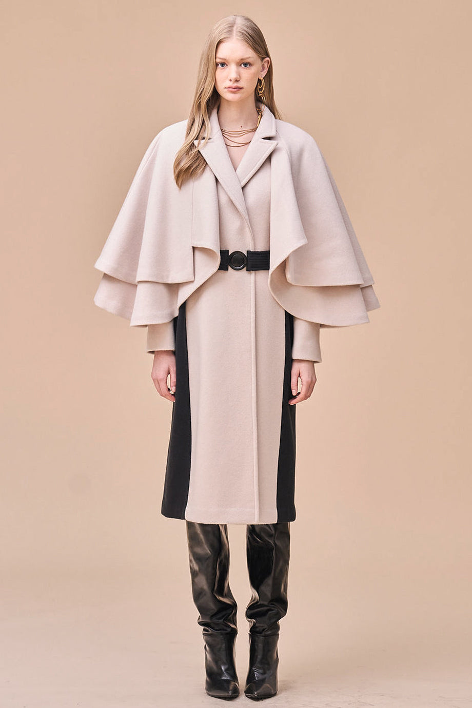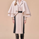 Abrigo de cachemir color marfil con detalle de capa acampanada de dos niveles. Ambiente femenino. Cinturón negro que resalta la cintura. Detalles laterales en contraste que crean una apariencia esbelta y alargada. Material de mezcla de lana y cachemir que ofrece un ajuste suave y cálido.
