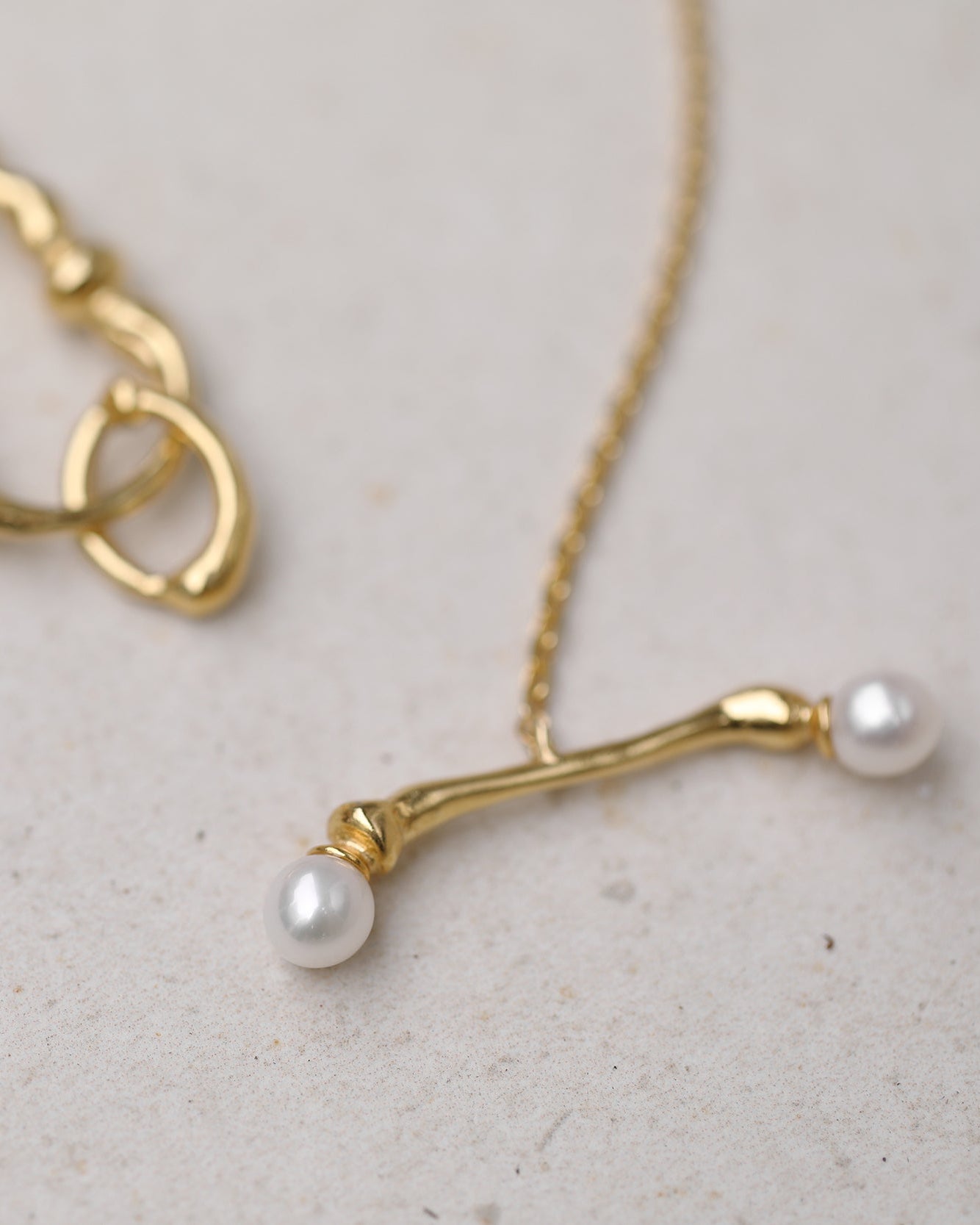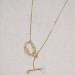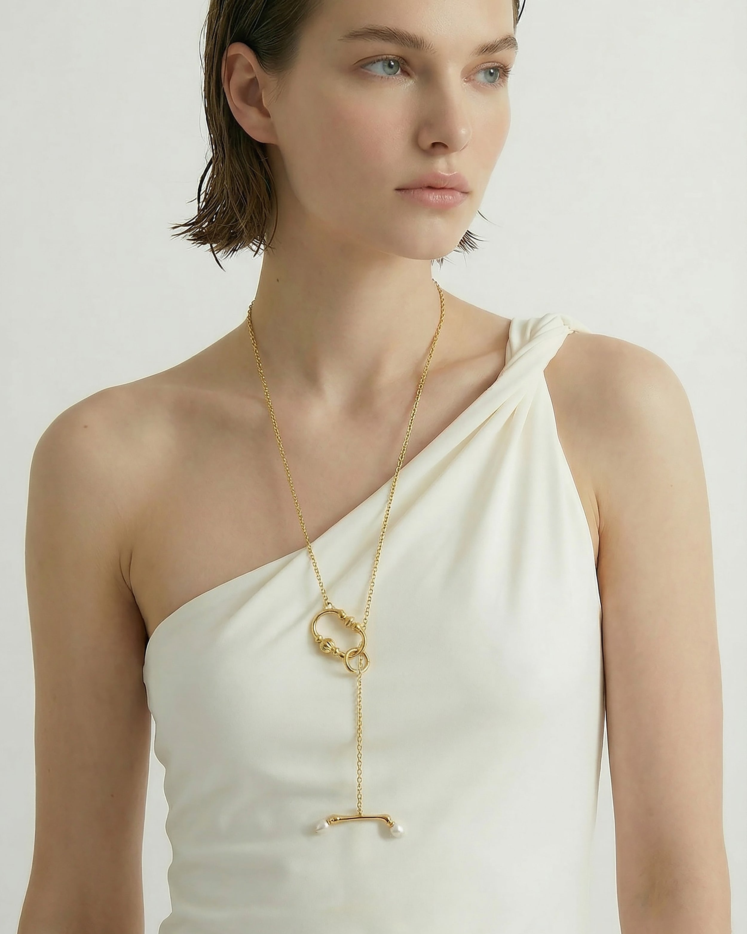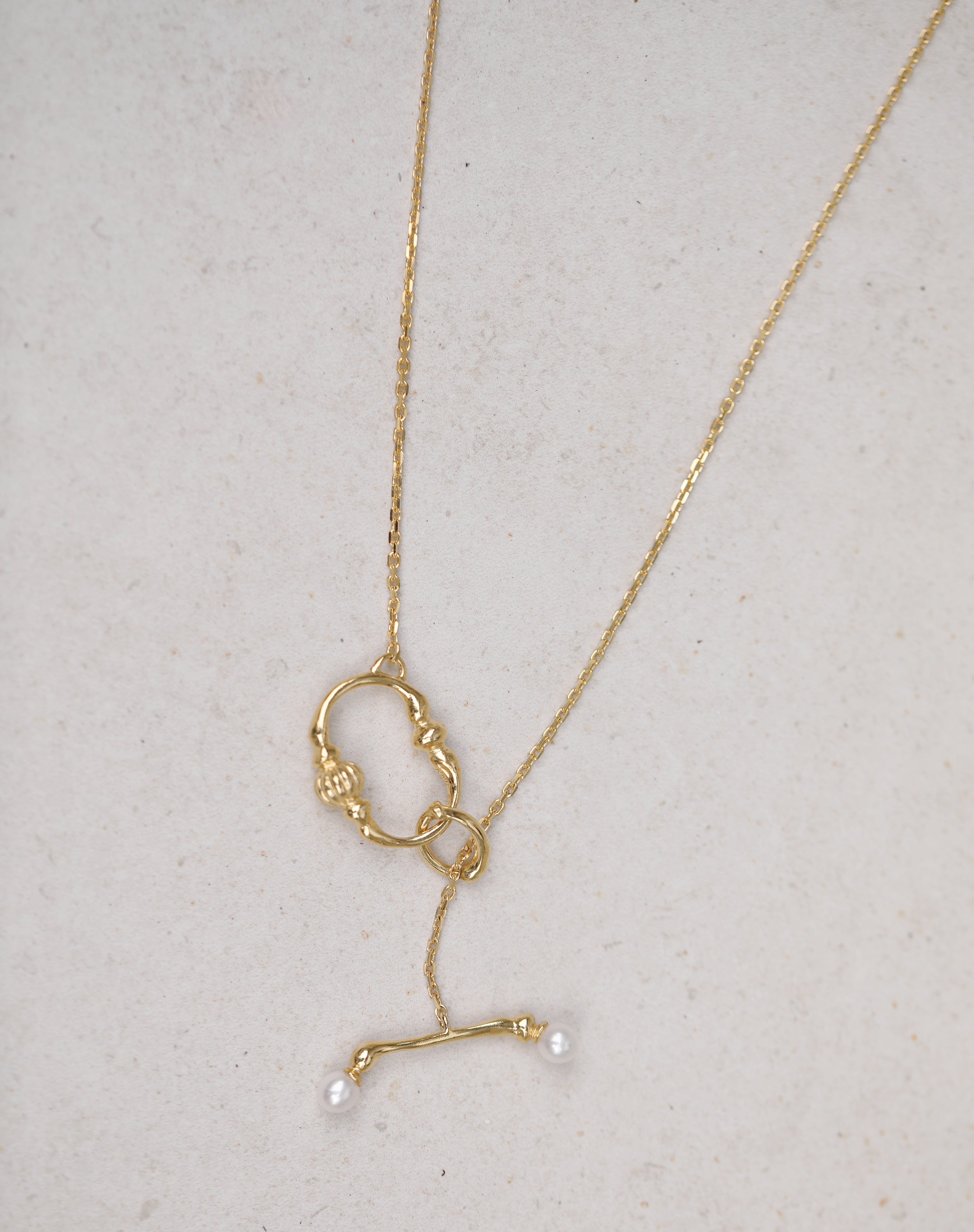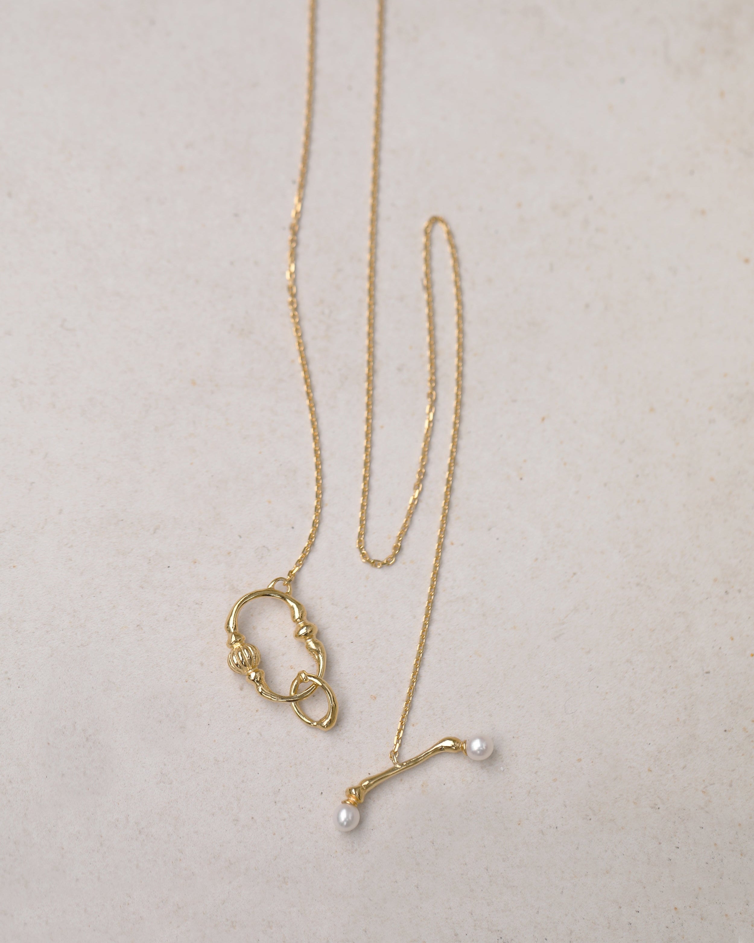 S'inspirant des heurtoirs de porte des XVIIe et XVIIIe siècles, ce collier associe une structure d'inspiration antique à des détails en perles délicates.