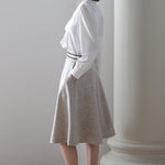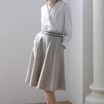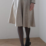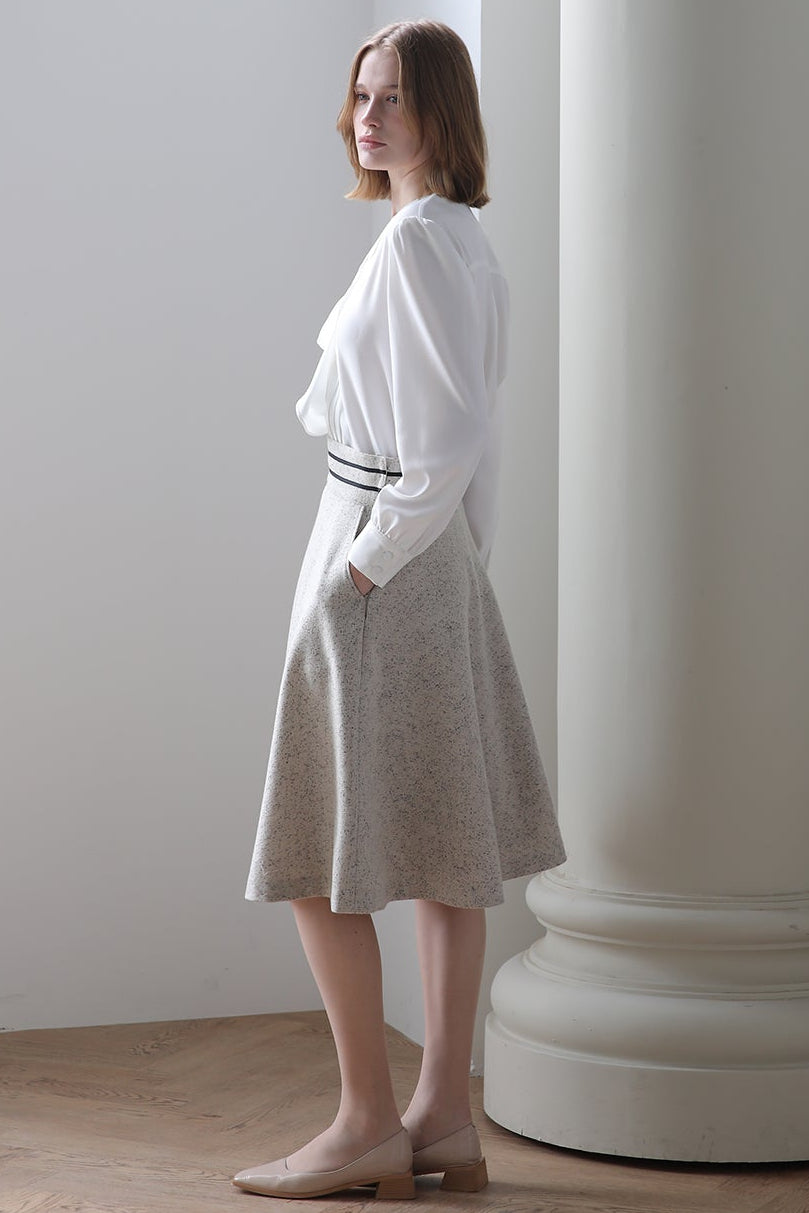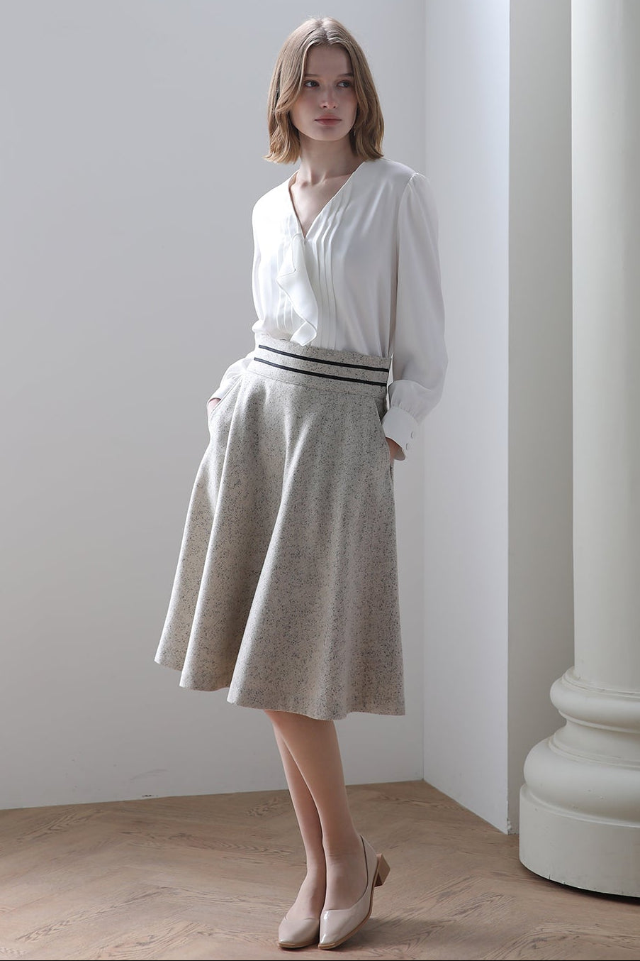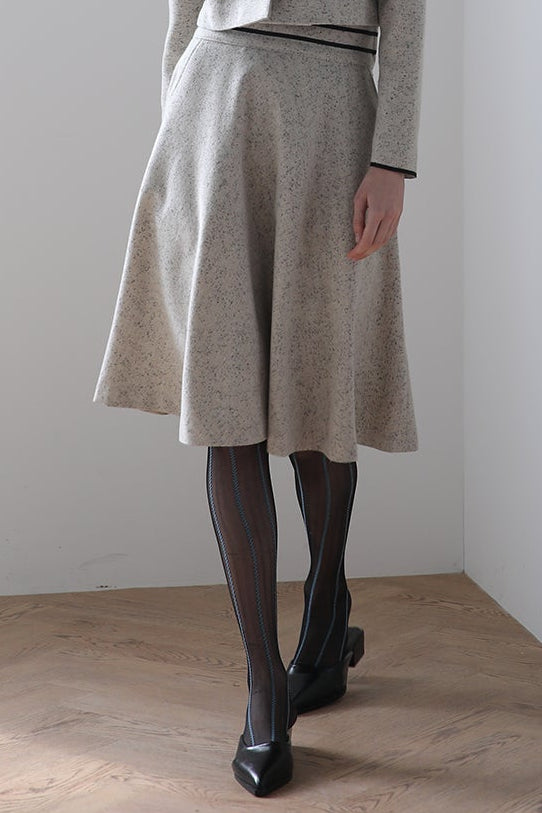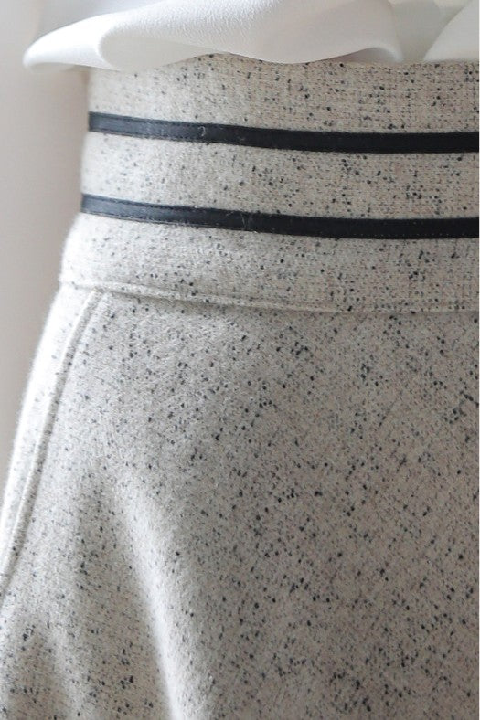 Une longueur midi qui tombe sous les genoux offre une coupe nette et stable. Un tissu tweed avec une subtile tonalité beige et une texture fine mélangée peut être facilement assorti à divers hauts tels que chemises, blouses et tricots.
