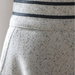 Une ambiance sophistiquée est créée avec un tissu tweed luxueux et un mélange de couleurs subtil. Un design de ceinture taille épaisse avec un liseré noir comme point focal. Un design qui affine visuellement la taille. Une silhouette évasée naturellement crée un volume élégant.