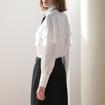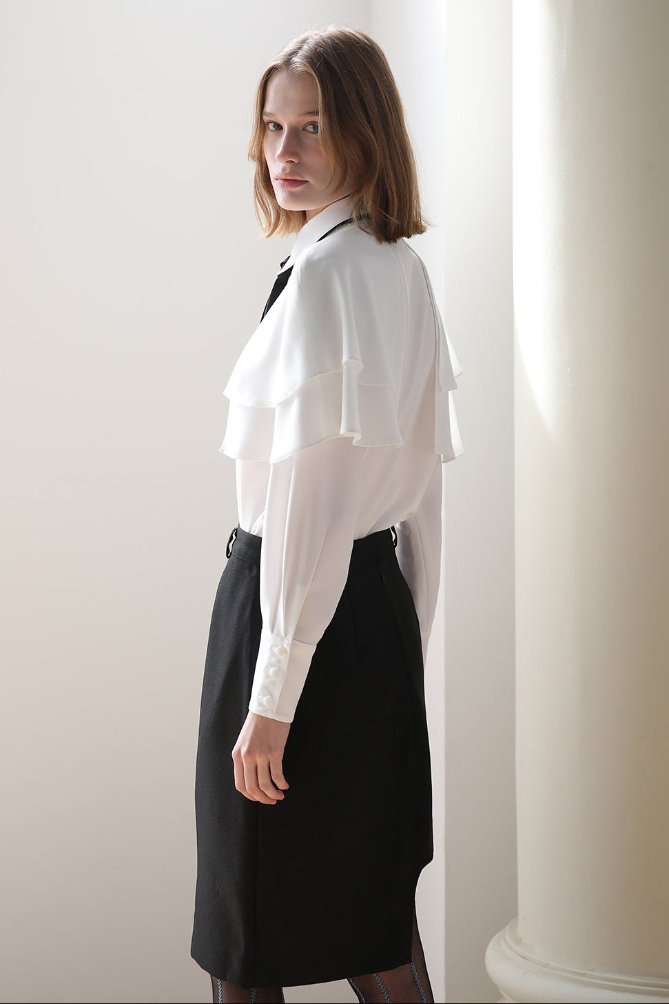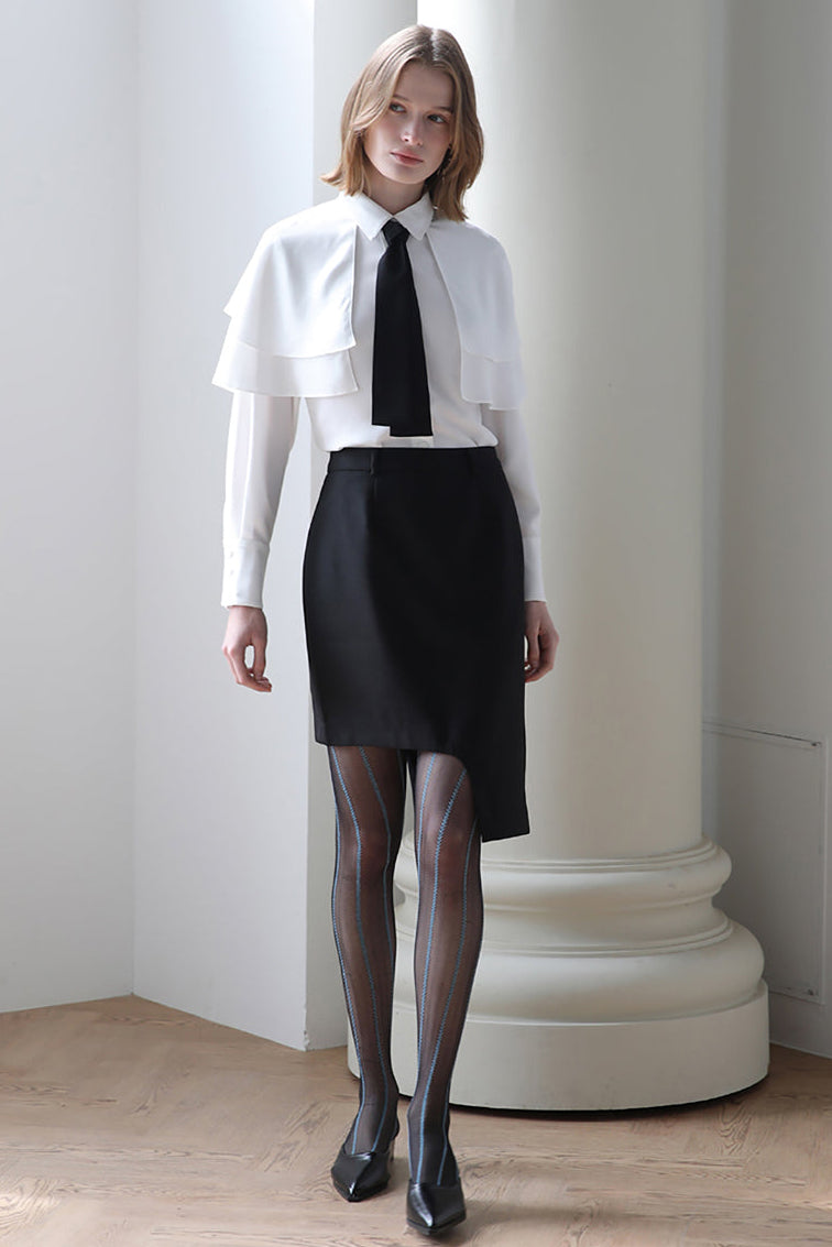 Une silhouette moderne est créée avec un ourlet déséquilibré aux longueurs différentes des deux côtés. Une ligne H slim crée un look net et sophistiqué.