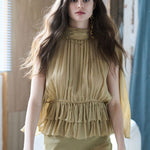 Blusa peplo in seta con maniche a mantella e scollo a taglio color senape