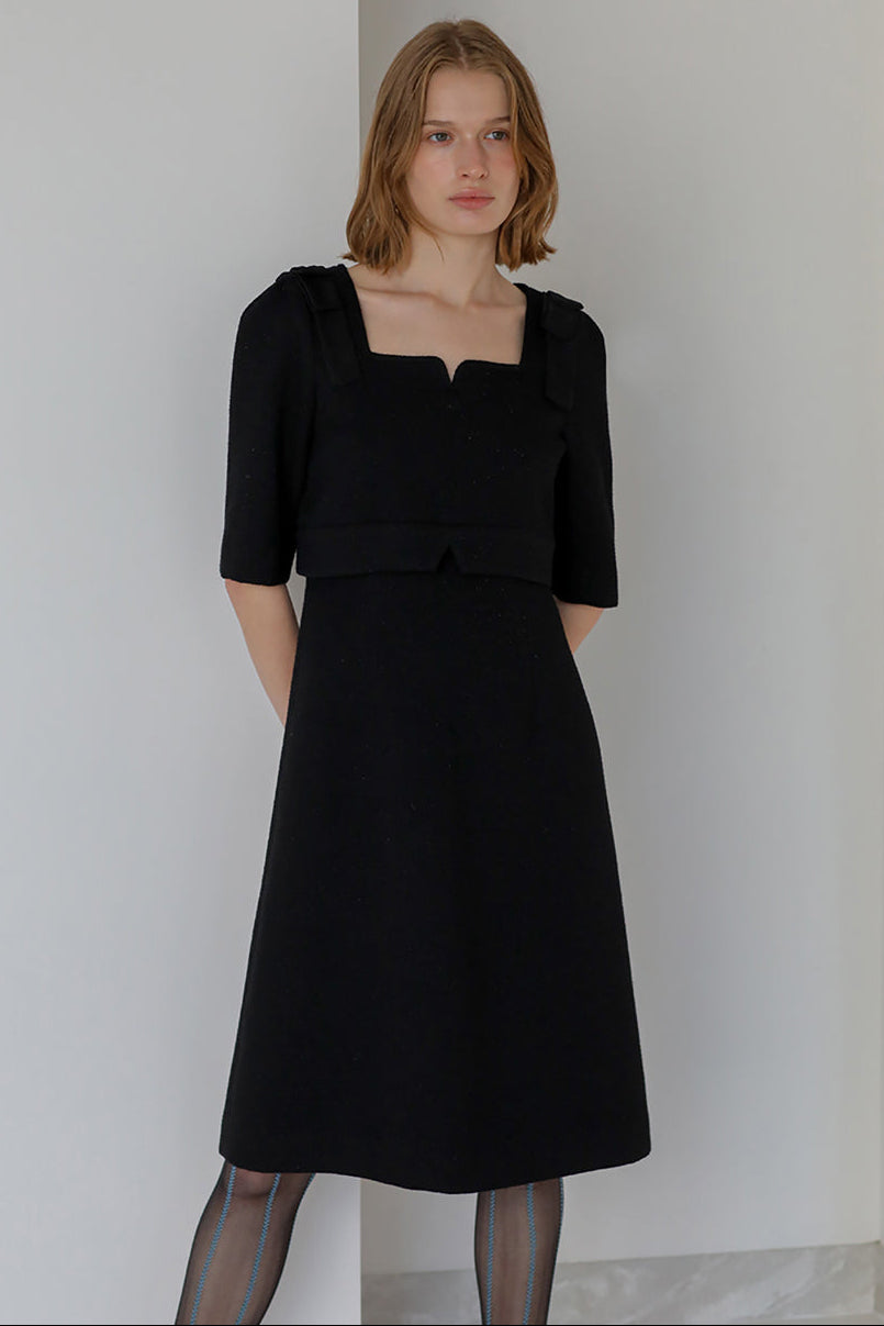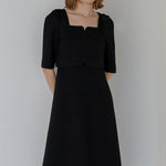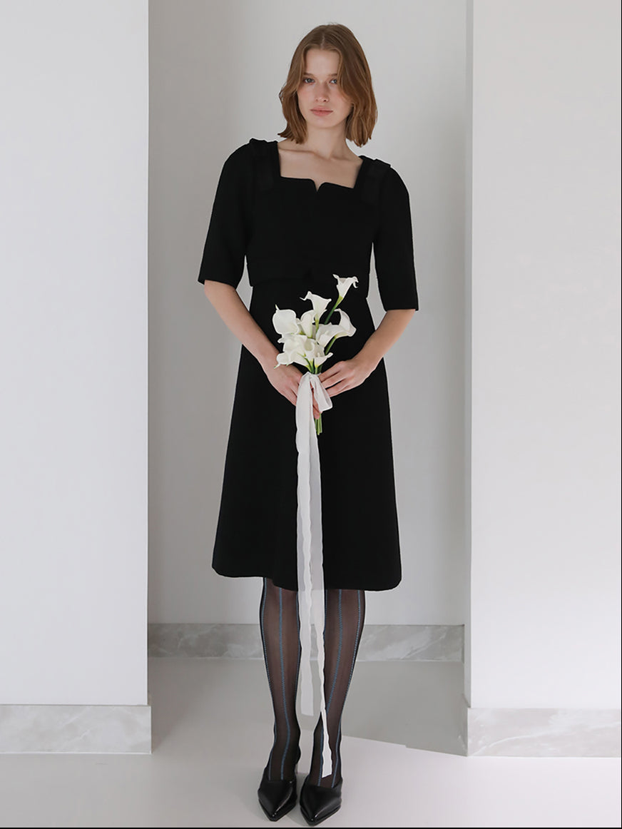 Abito monopezzo nero con scollo quadrato, nastro e dettaglio a punta per look da ospite