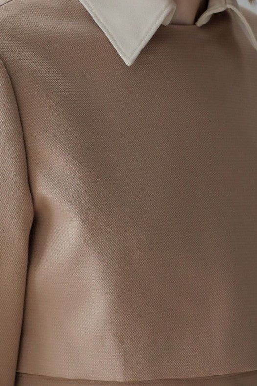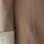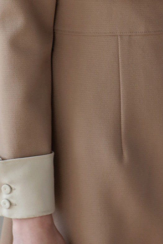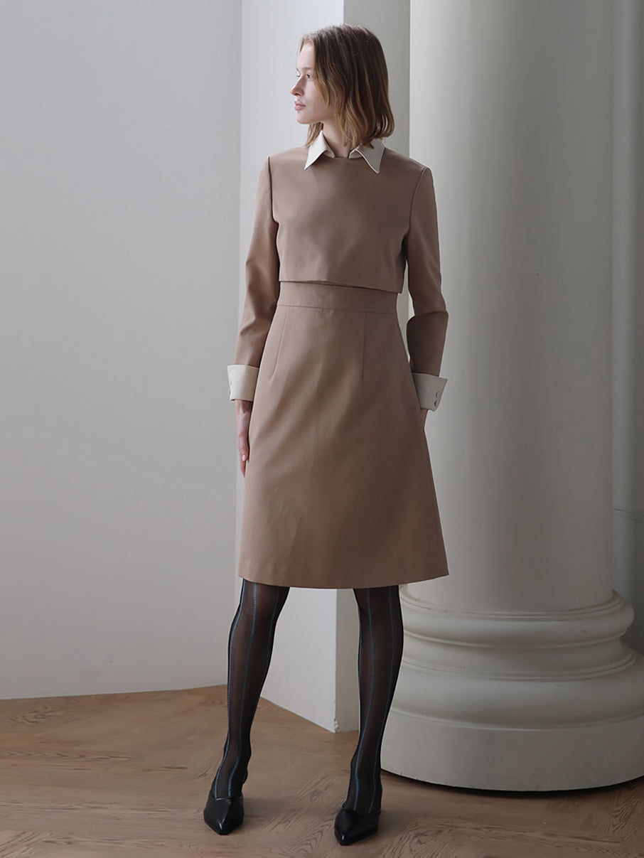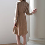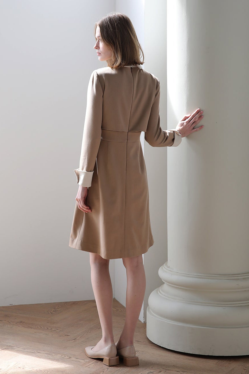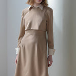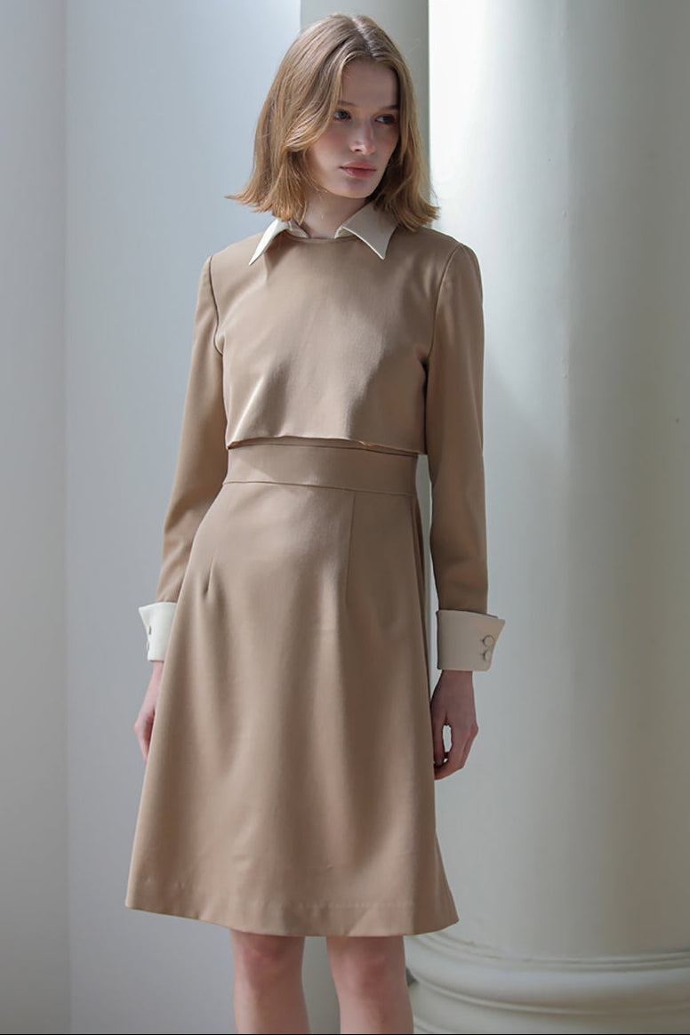 Un abito beige a linea ad A che completa un'atmosfera lussuosa e ordinata. Il colletto e i polsini a contrasto color crema creano un punto sofisticato. La silhouette pulita e la vestibilità stabile si adattano bene alle occasioni formali. La linea di taglio in vita enfatizza la figura snella e valorizza la forma naturale del corpo.