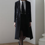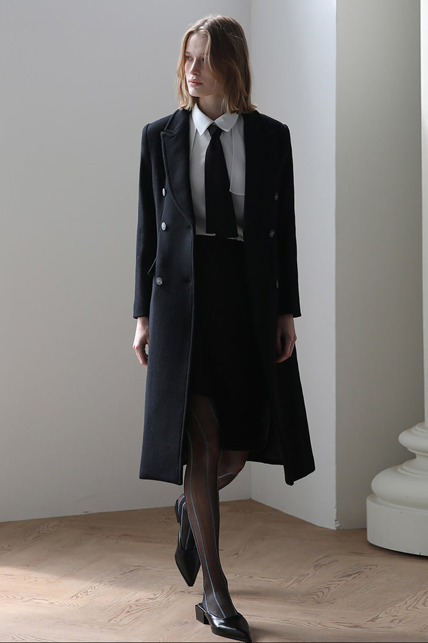 La vestibilità slim dritta che cade naturalmente lungo la linea della vita enfatizza una silhouette lunga e ordinata. La fodera liscia offre una finitura morbida e pulita. La lunghezza lunga che scende sotto il ginocchio fornisce calore e una proporzione equilibrata. Può essere abbinata a una camicia bianca e cravatta nera per un mood classico da completo, o a un maglione per un look quotidiano. Un capo senza tempo che si abbina bene a occasioni formali, look da lavoro e look formali quotidiani.