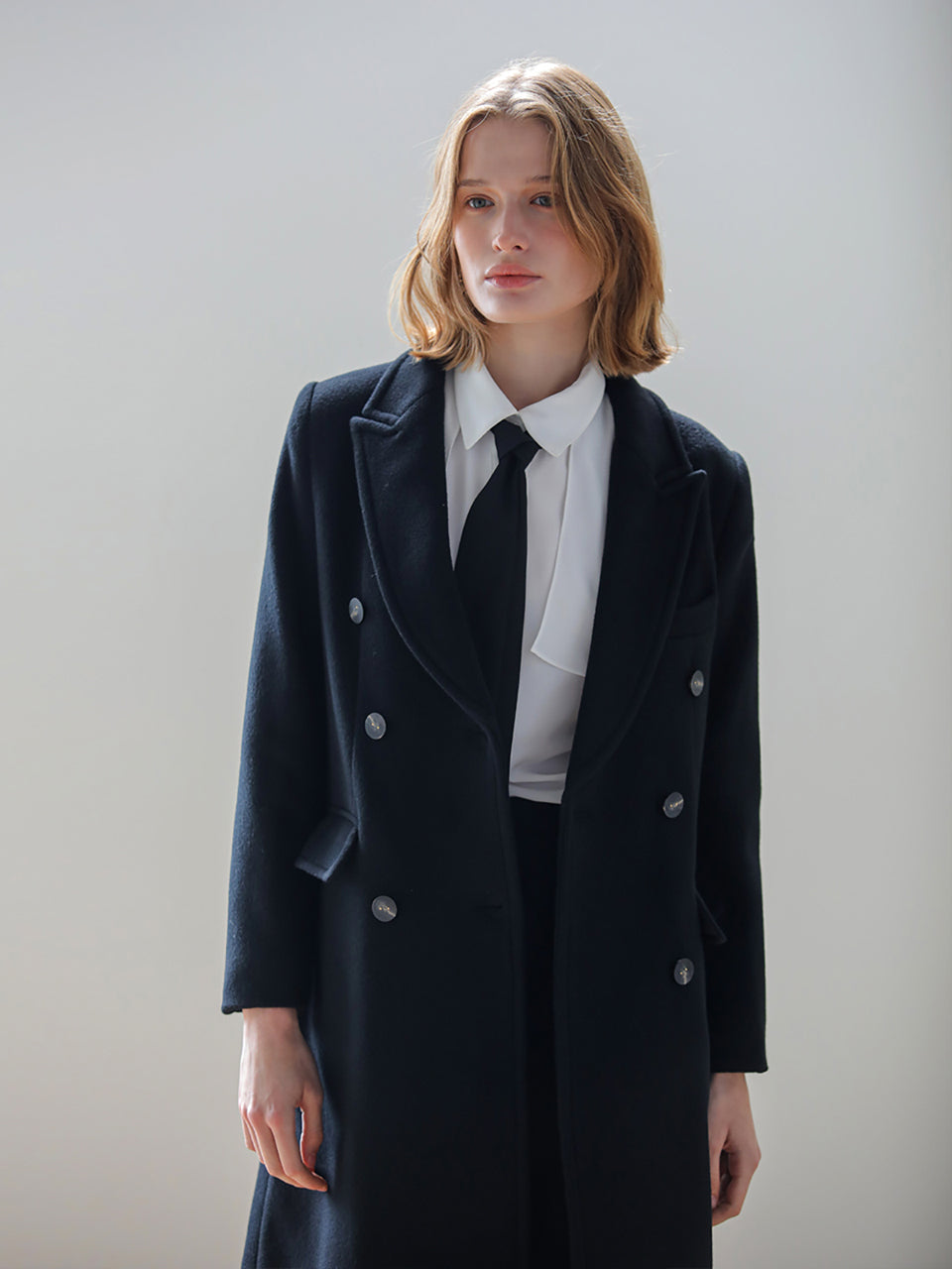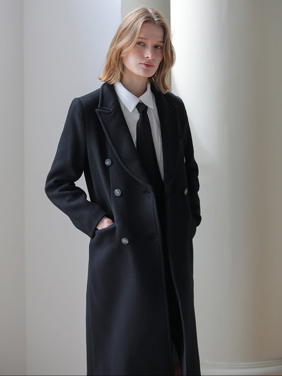 Un cappotto lungo sartoriale con una silhouette strutturata realizzato con un solido misto lana. La chiusura doppiopetto con bottoni crea un mood classico e sofisticato. Ampi revers a punta e dettagli discreti creano un'impressione formale ma moderna.