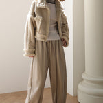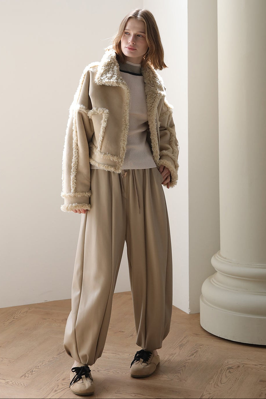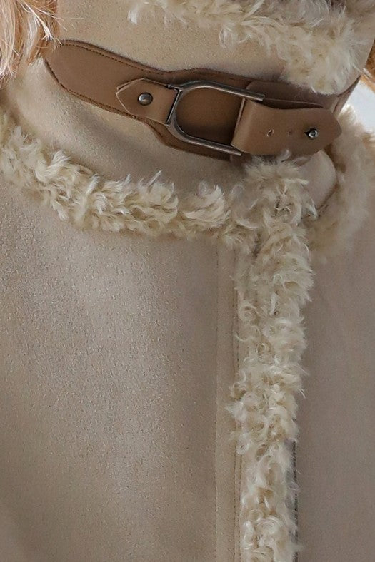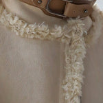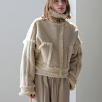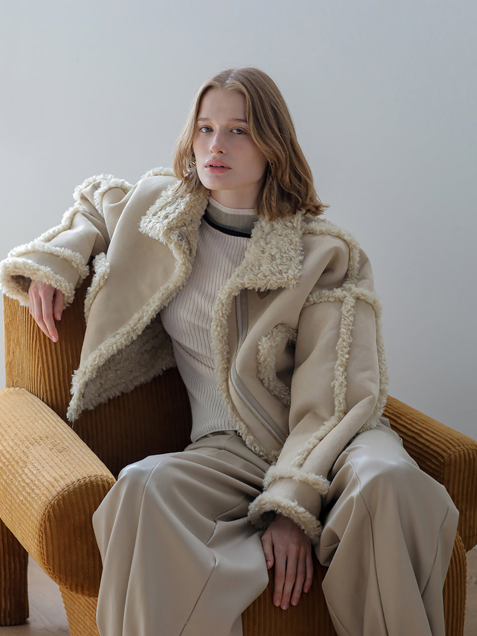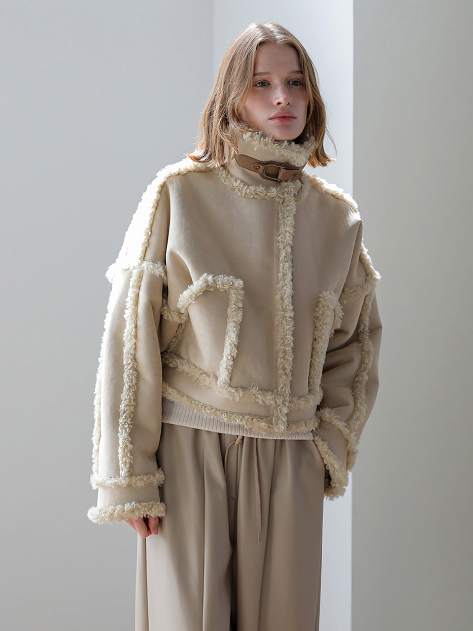 Una giacca in shearling a collo alto realizzata con materiale mustang caldo e accogliente. La combinazione della texture morbida del suede e del ricco bordo in pelliccia crea un'atmosfera lussuosa. Il dettaglio della cintura in pelle sul collo soddisfa sia il calore che i punti di design.