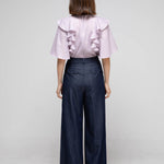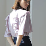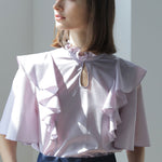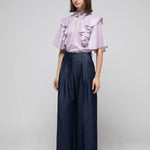 Blusa viola con scollo a portafoglio, volant e vestibilità ampia