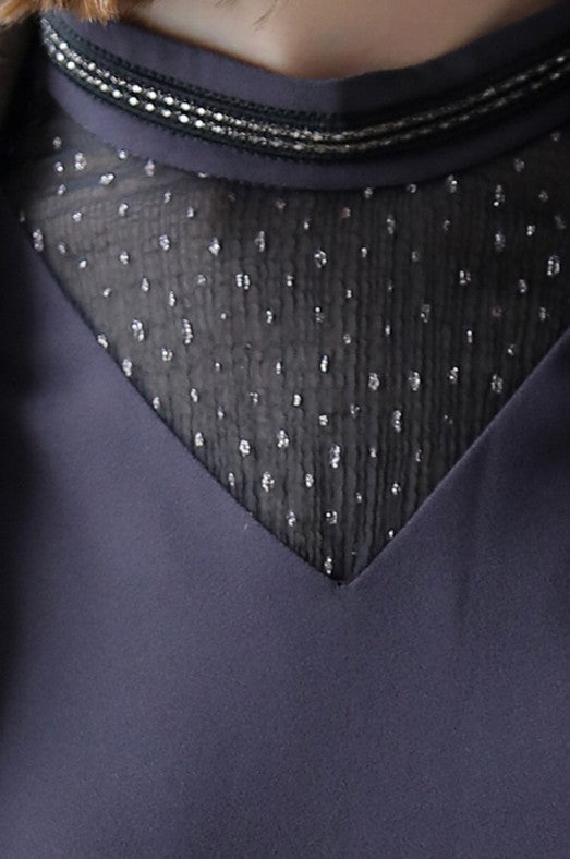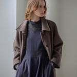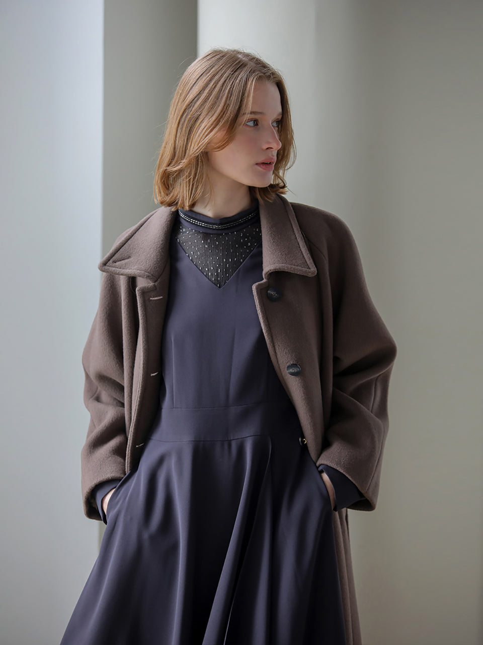 Un dettaglio in pizzo con collo alto è aggiunto alla scollatura a V per completare un punto elegante e classico. La linea del drappeggio che cade naturalmente esprime una silhouette femminile in movimento. Il dettaglio arricciato sulle spalle aggiunge volume per enfatizzare la linea tridimensionale. La linea di taglio in vita organizza le proporzioni del corpo per completare una vestibilità snella e ordinata.