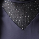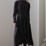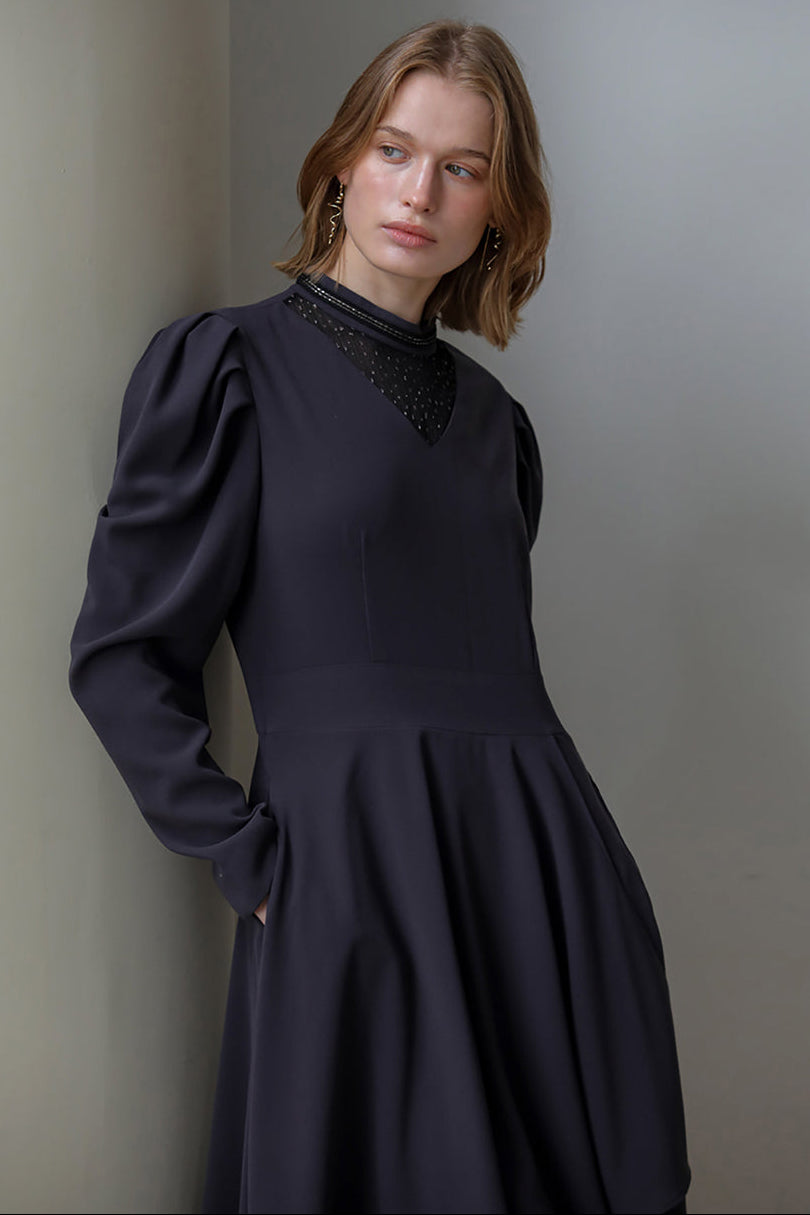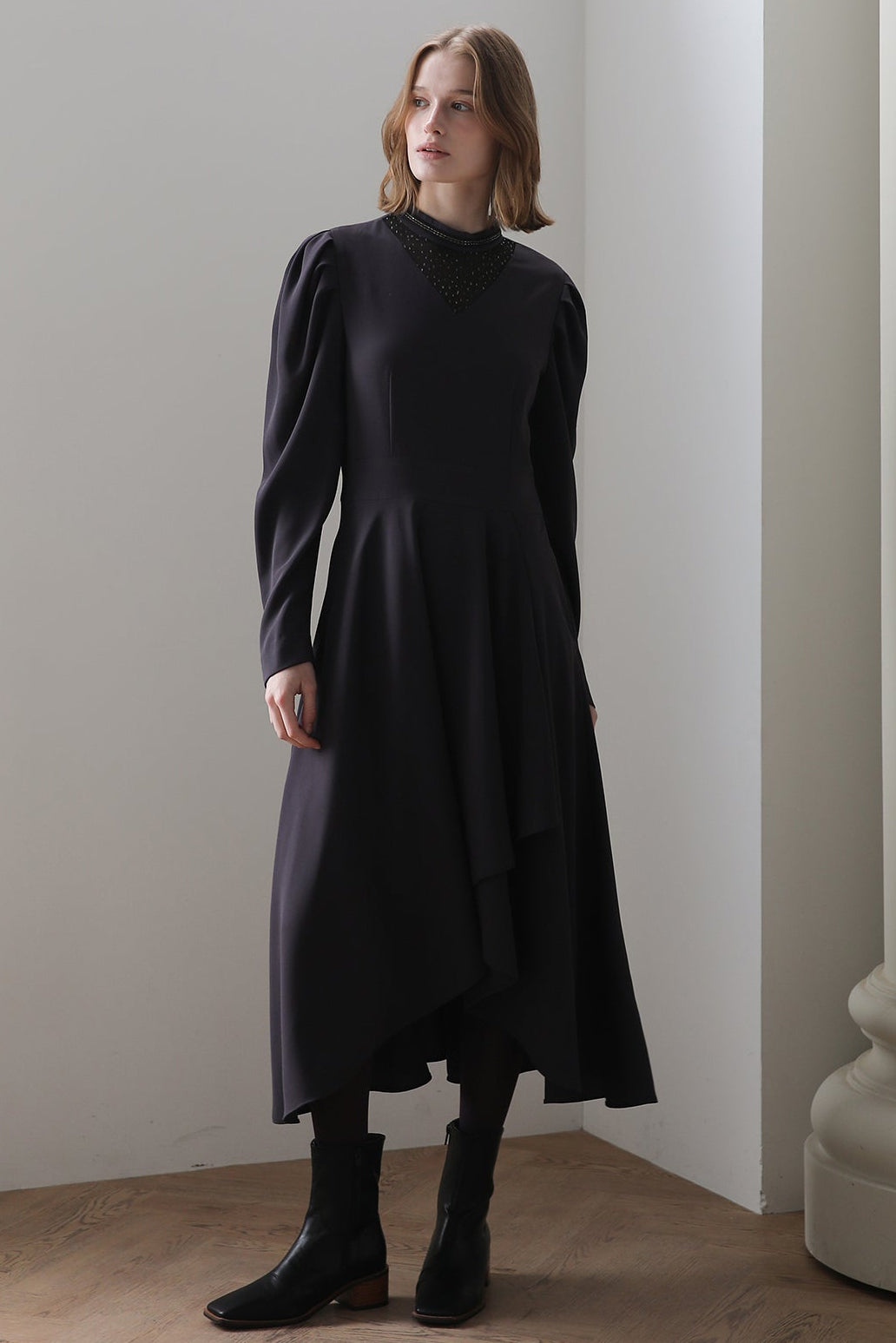 Abito monopezzo asimmetrico con scollo a V, pizzo e collo alto drappeggiato