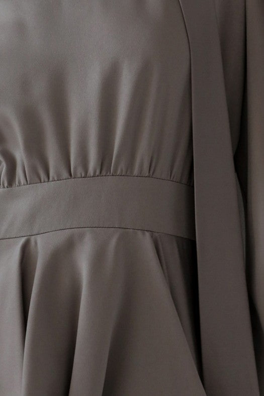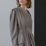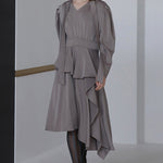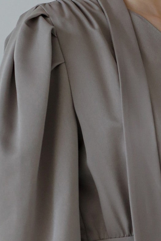 I dettagli arricciati sulle spalle creano una silhouette tridimensionale aggiungendo volume. L'orlo sbilanciato crea una curva naturale per un drappeggio elegante. Un design che può essere indossato con dignità in varie occasioni come look per invitati a matrimoni, look da cena e occasioni formali.