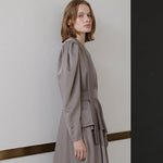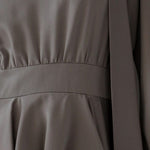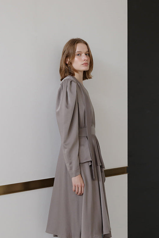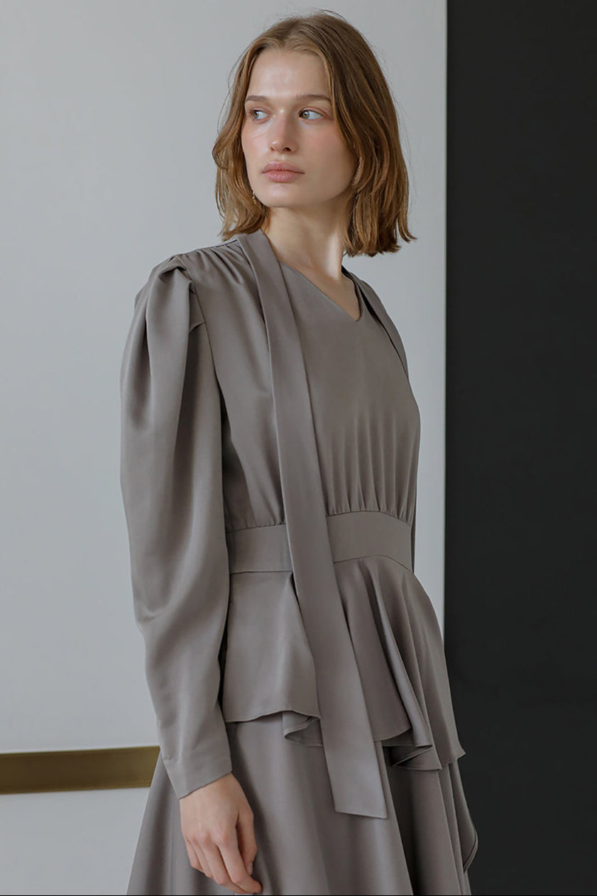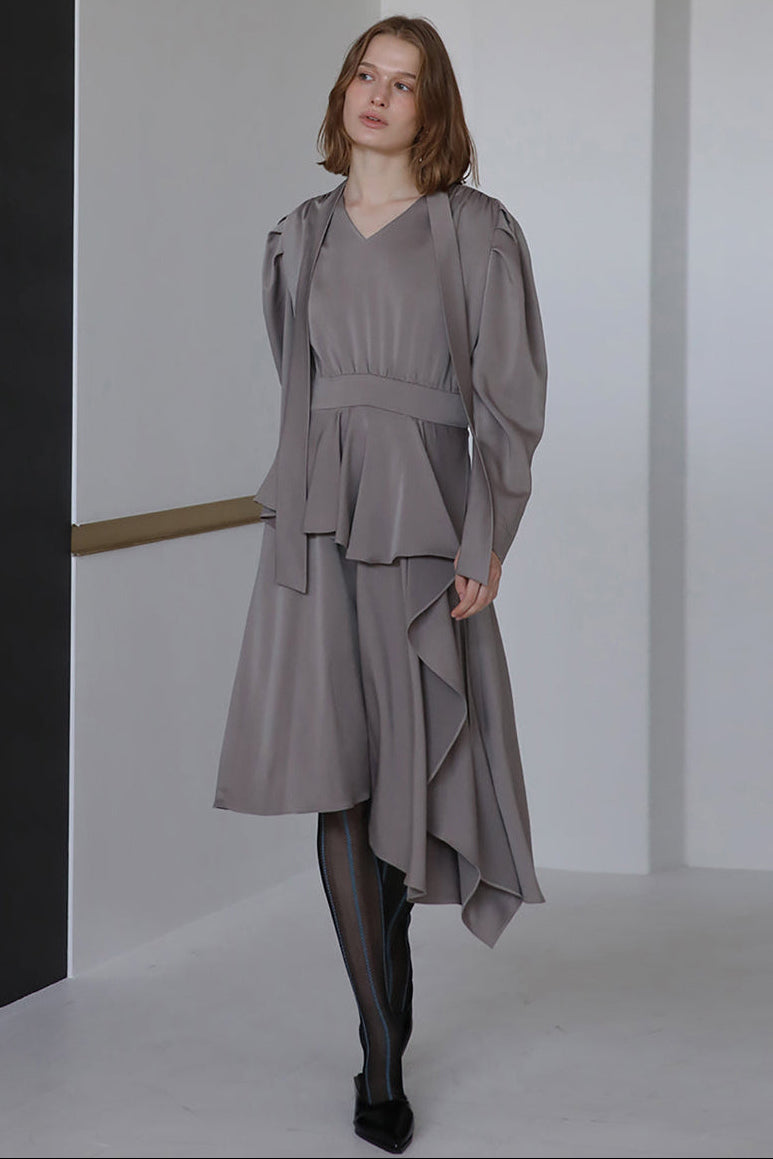 Un materiale morbido con una sottile lucentezza crea un'atmosfera lussuosa e sofisticata. I dettagli con fiocco sulla scollatura a V completano una silhouette morbida ed elegante. La linea del drappeggio che scorre naturalmente enfatizza un'atmosfera femminile in movimento. La linea di taglio in vita organizza le proporzioni del corpo per esprimere una silhouette snella.