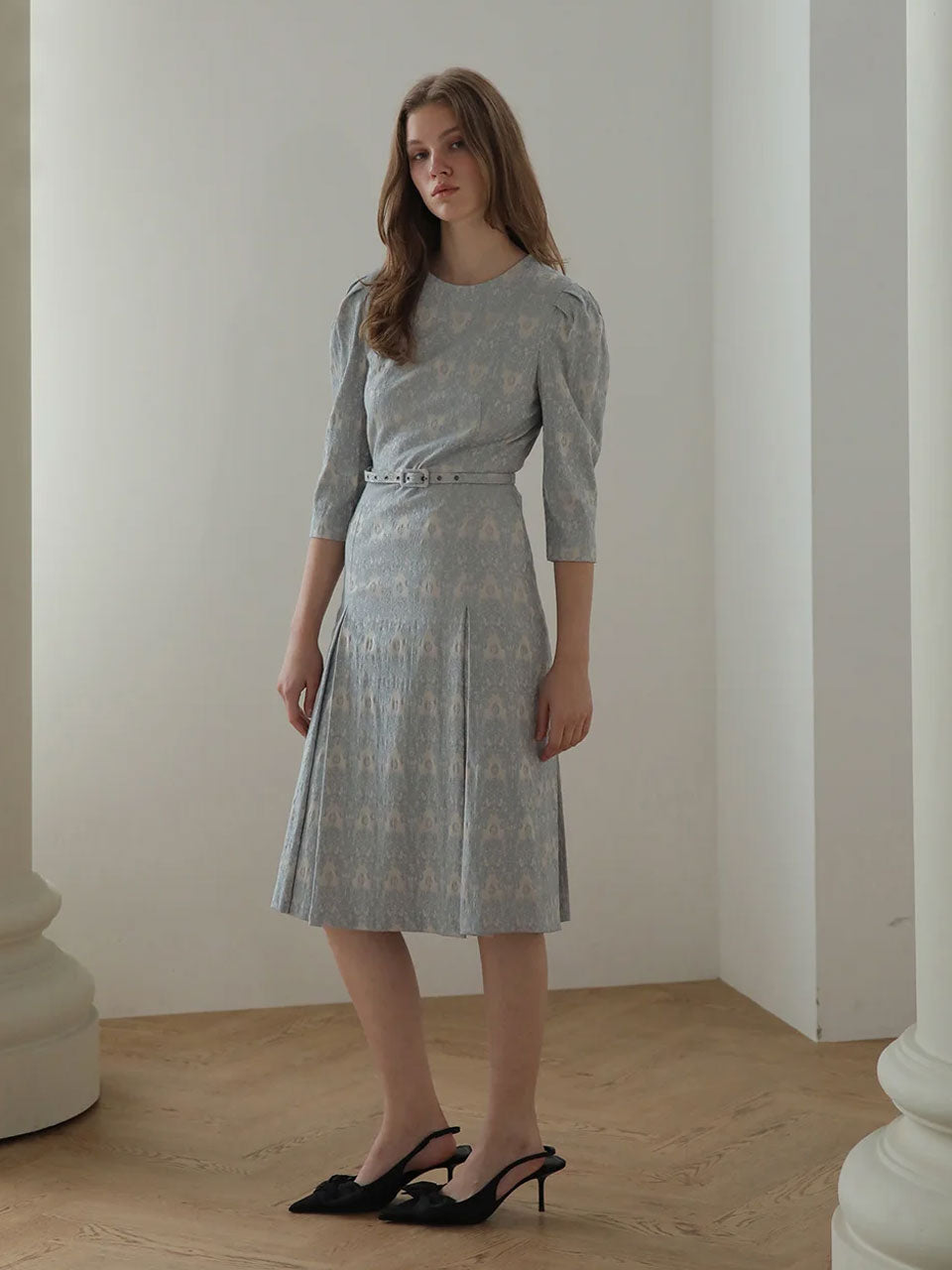 Gaun midi garis h sulaman biru langit gelap