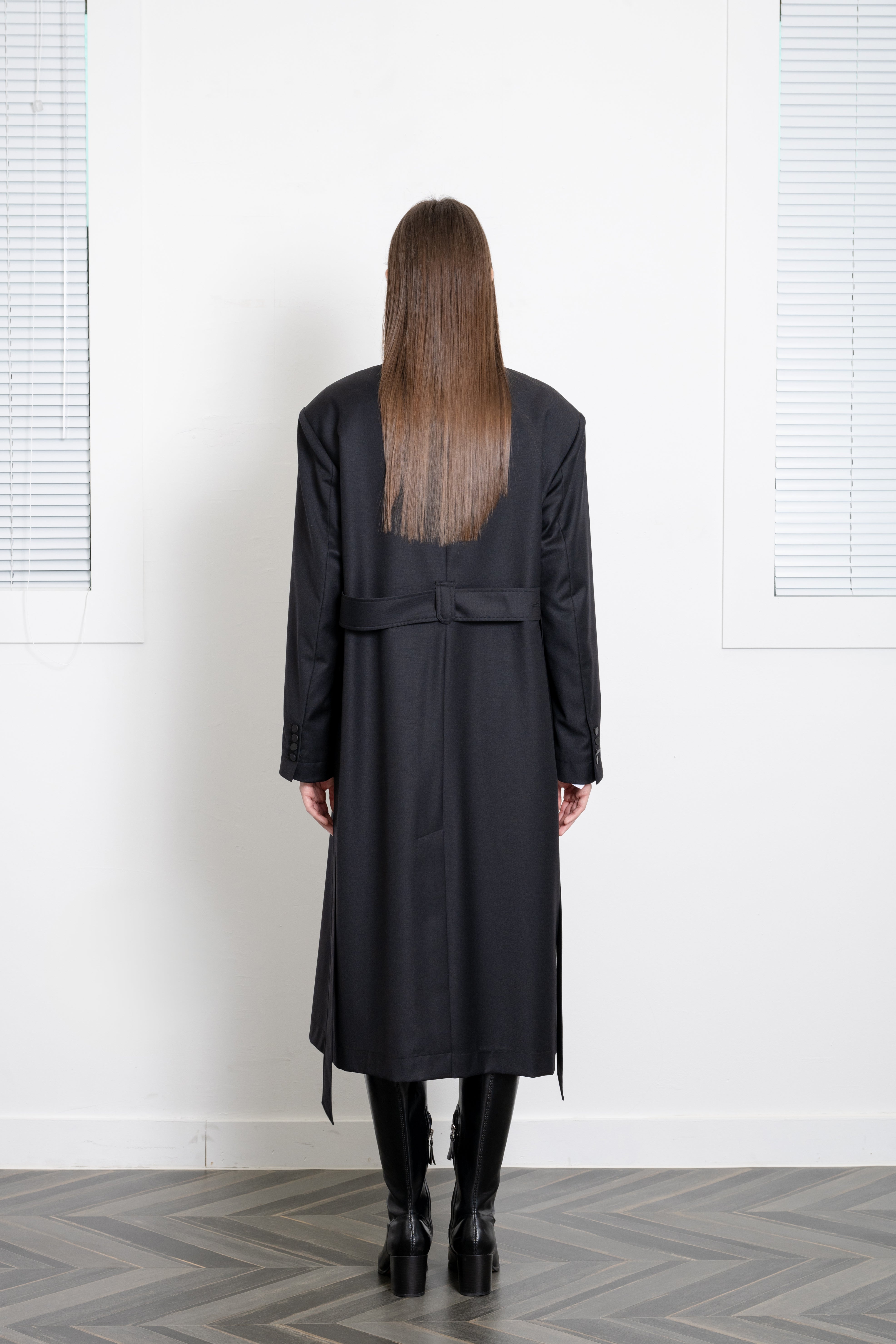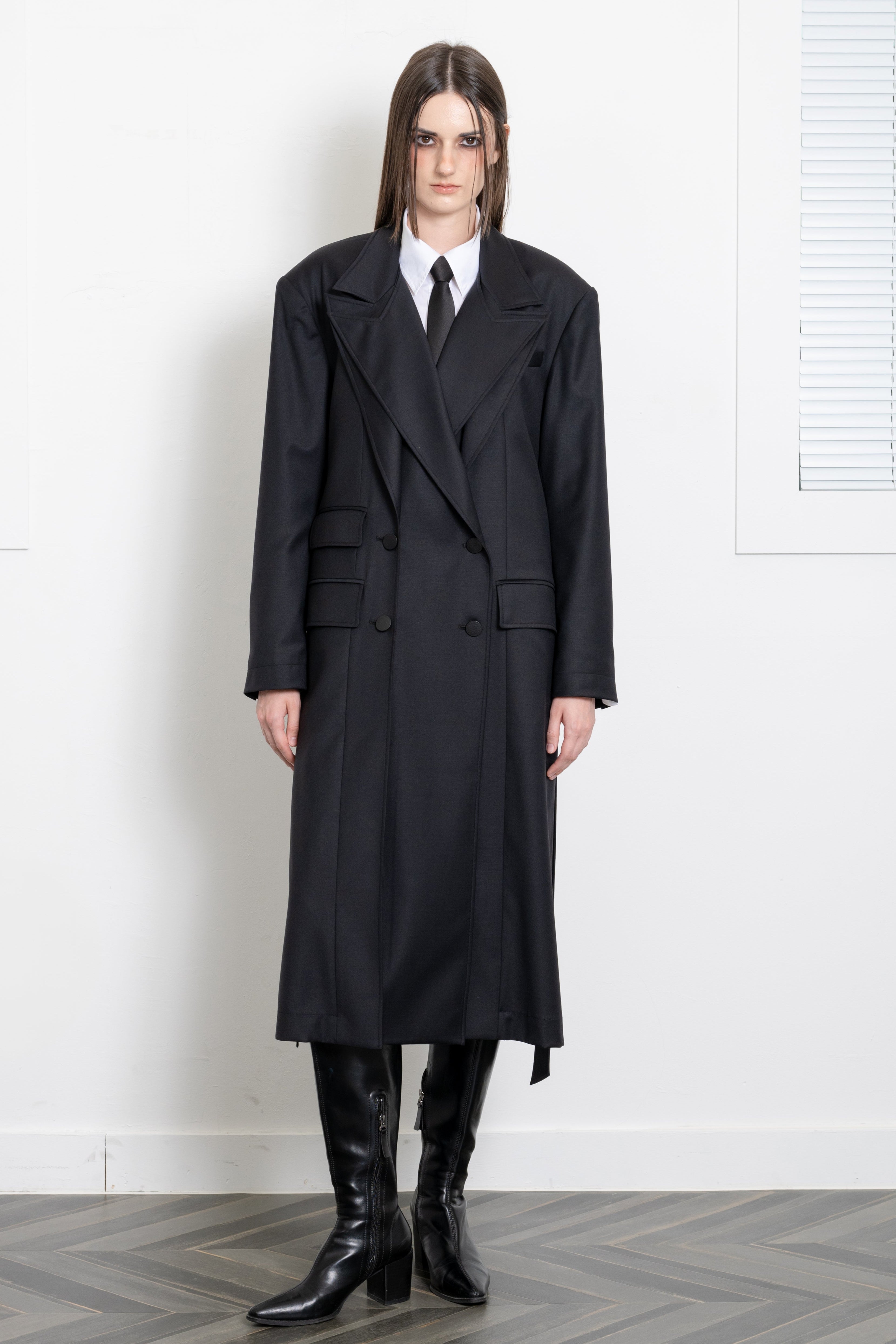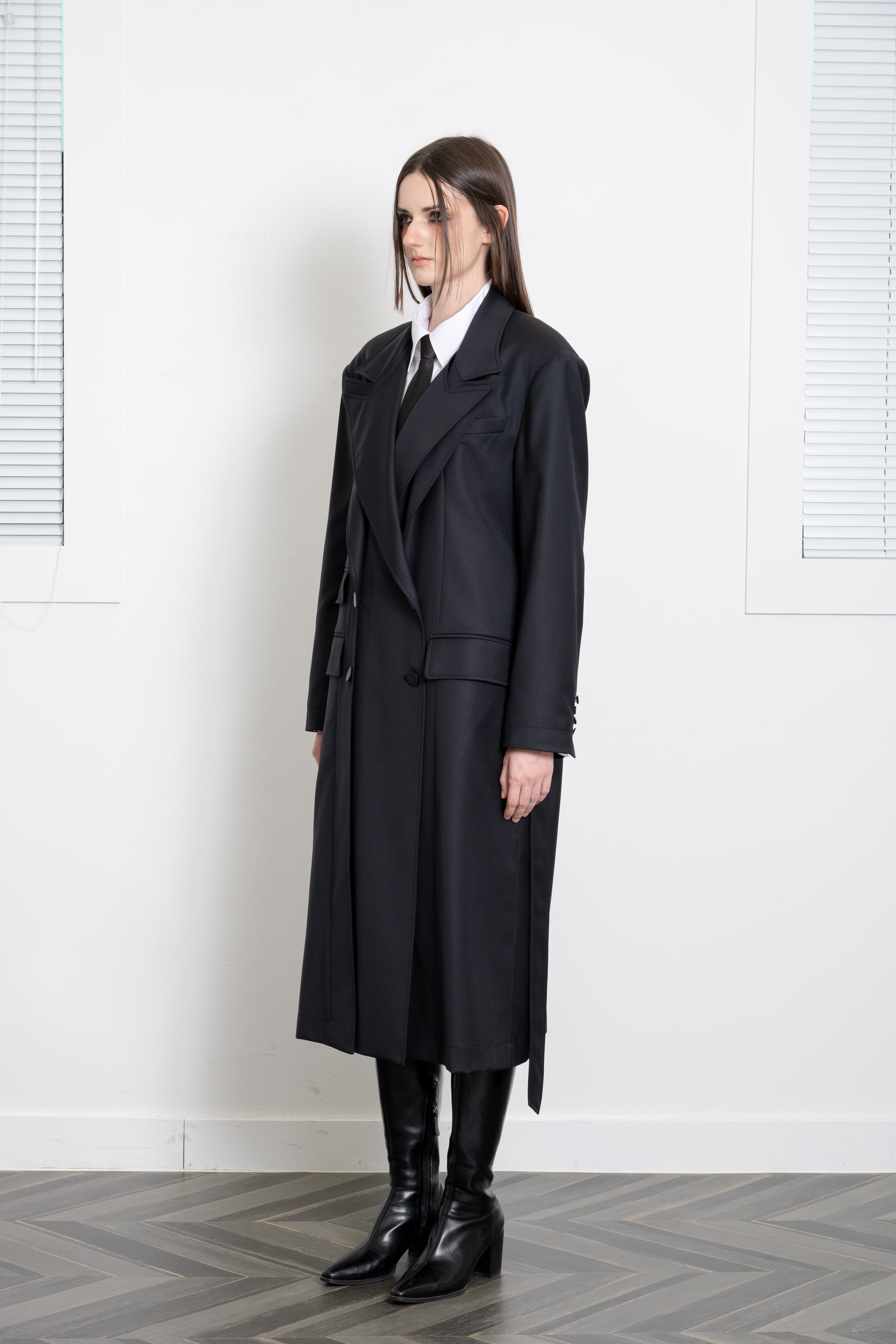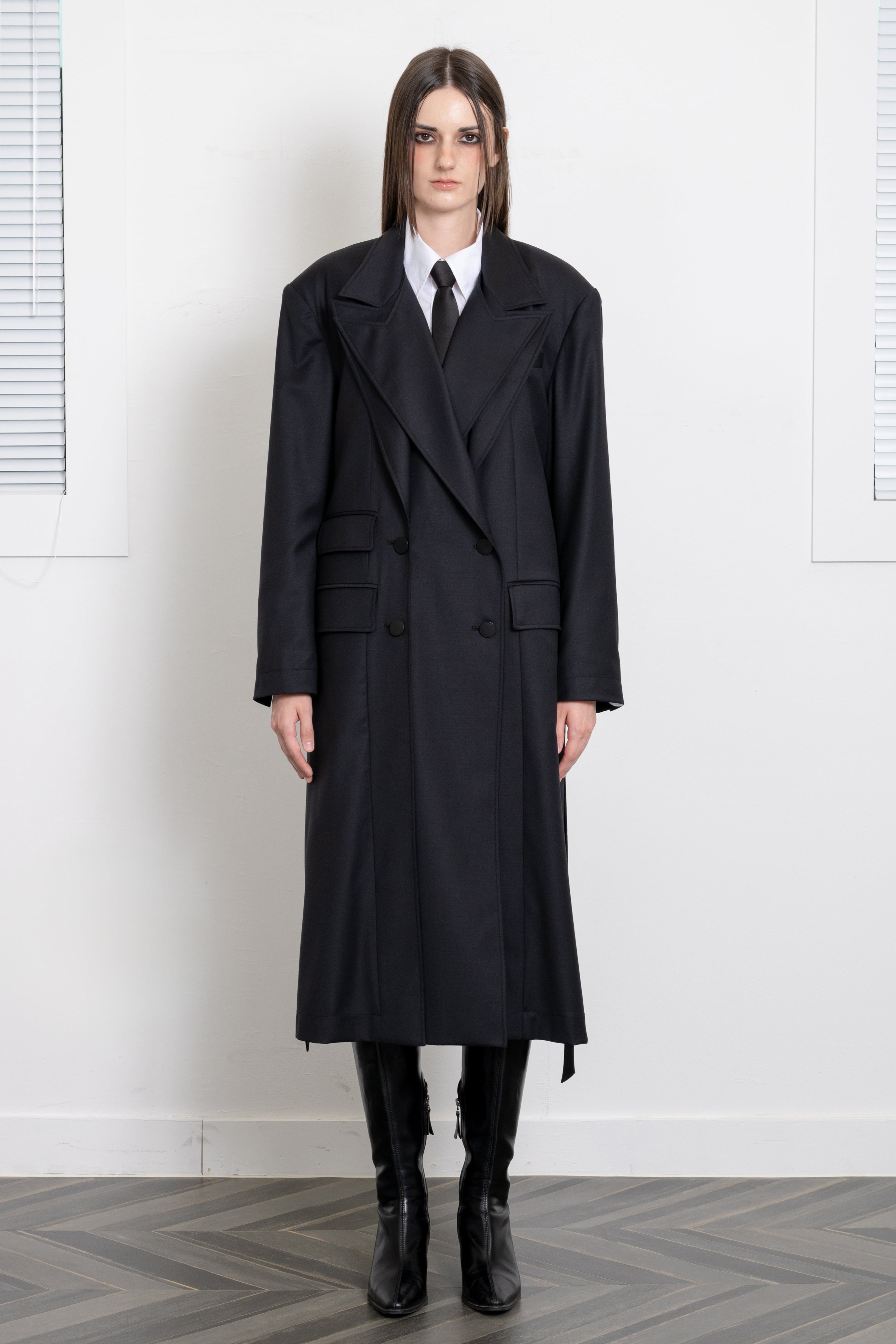 Jubah panjang yang direka rapi ini menampilkan siluet tajam dan memanjang yang ditentukan oleh pembinaan yang tepat. Garis yang bersih dan perkadaran yang tersusun menyampaikan kewibawaan yang terkawal dengan hiasan yang minimum. Lapiskan ia ke atas gaya yang disesuaikan dan santai untuk keanggunan moden yang berpanjangan.
