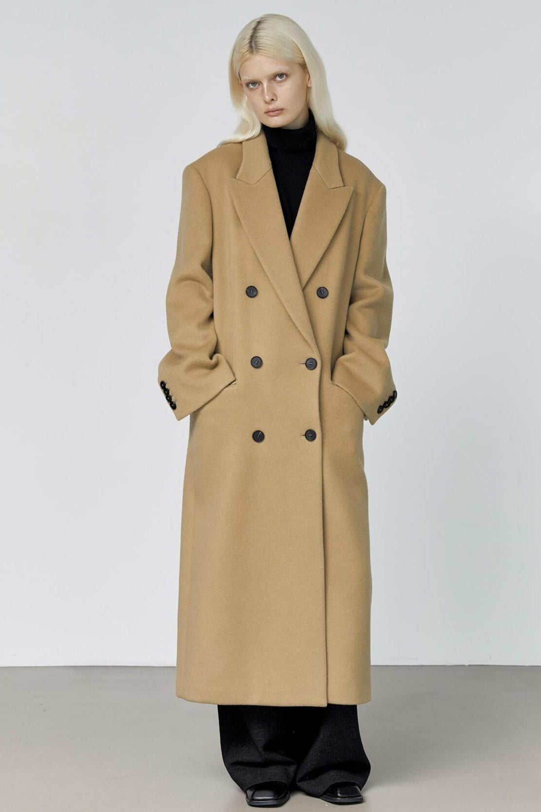 This is an oversized tailored double-breasted coat with a classic vibe. Shoulder pads are used to create a sturdy shoulder line without collapsing, and the overfit silhouette falls neatly all the way to the hem, providing a cozy and comfortable fit.