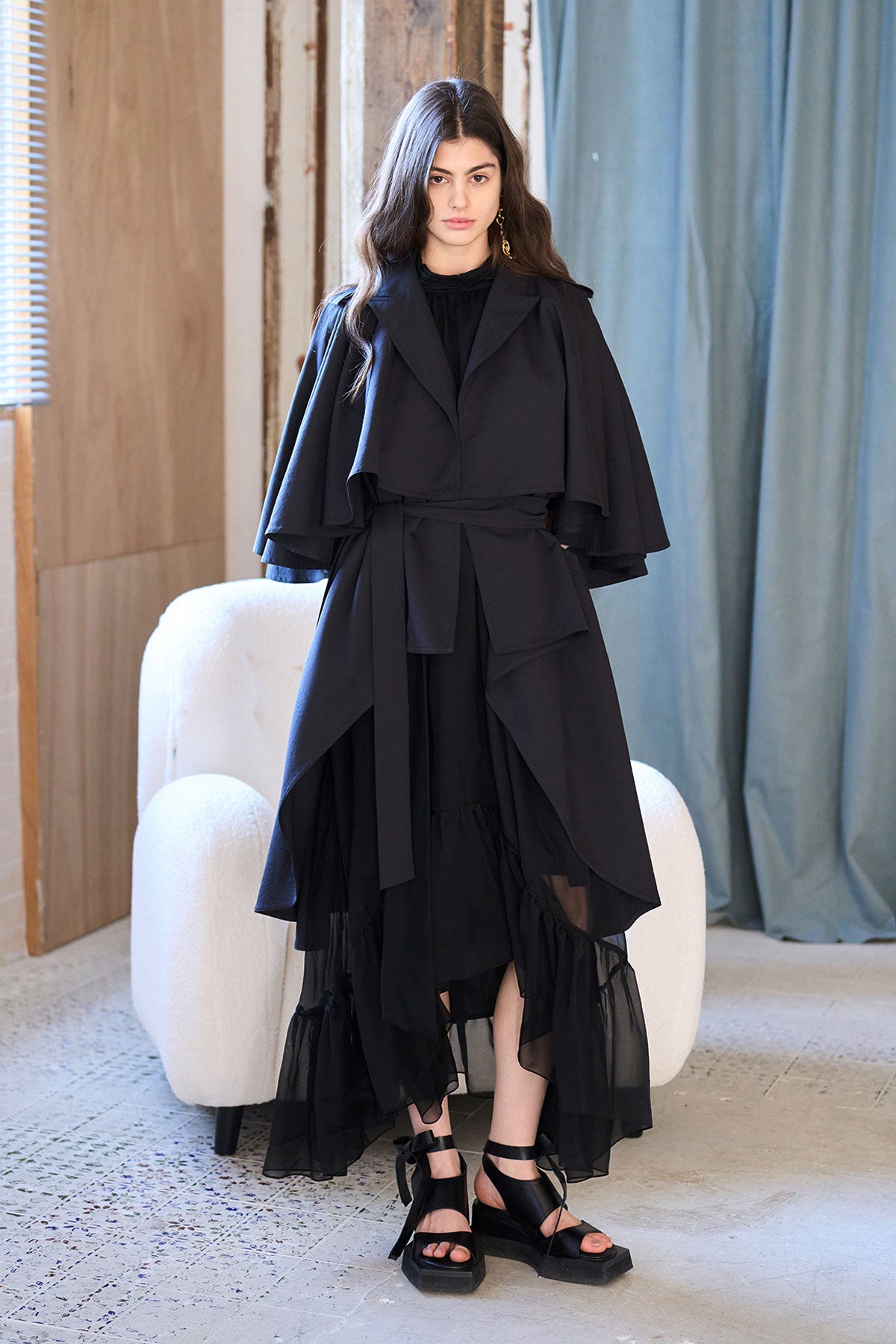 Casaco trench assimétrico preto com corte solto, capa e manga recortada