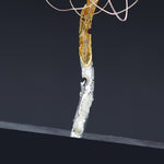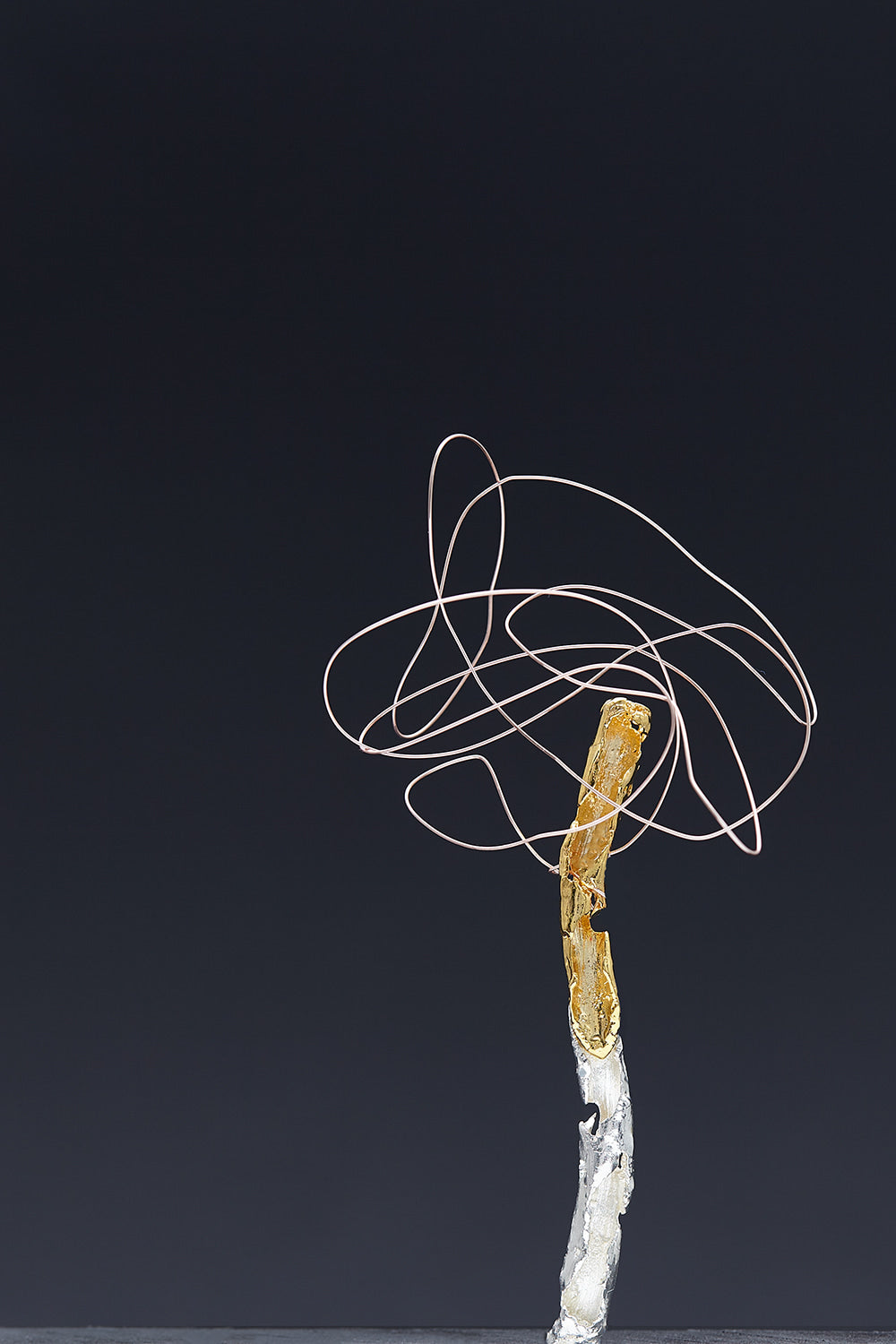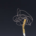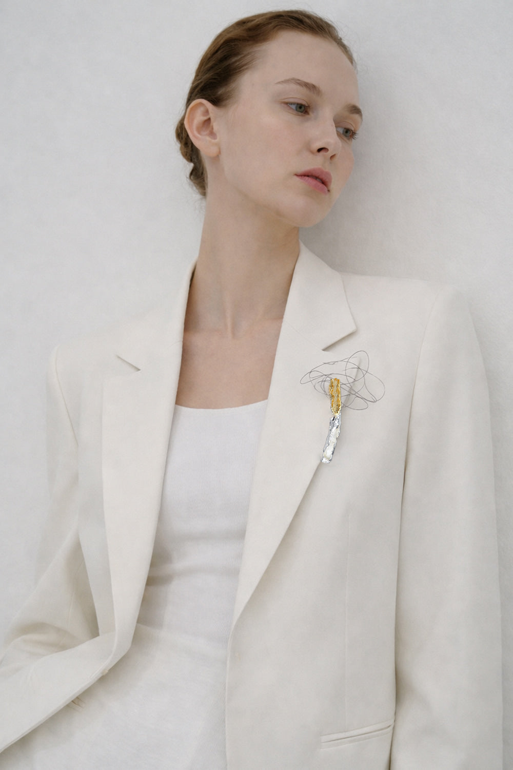Ruach Line (חוּר) refere-se a uma linha moldada não pela estrutura, mas pelo sopro, movimento e fluxo invisível. Nesta obra, a forma metálica oca não se sustenta pelo peso ou solidez. Está equilibrada por um movimento invisível — um estado de vir a ser em vez de uma forma fixa. As linhas metálicas elásticas acima da forma traçam o percurso do ruach: sopro, vento e a força subtil que mantém a forma sem a preencher. Este broche explora uma condição em que a forma se mantém não pelo peso, mas pelo movimento que a atravessa. Verso acabado com fecho magnético. Gravado com o nome da artista, Sarah J. Park.