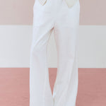 Este artigo é feito de um tecido de linho e algodão cor de marfim que oferece excelente respirabilidade, proporcionando uma sensação fresca e refrescante. Pregas prensadas na frente e no centro das costas criam a ilusão de pernas mais longas. Com a sua silhueta longa bootcut, este par de calças é intemporal e fácil de combinar com uma variedade de peças, tornando-o uma peça versátil para uso a longo prazo. Para maior conforto, apresenta um cós elástico, cordões ajustáveis na cintura e bolsos laterais práticos.