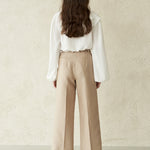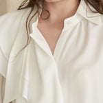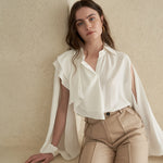 Белая несбалансированная блузка с застежкой на пуговицы, слегка сдвинутая влево. Двойные оборки под правым воротником создают яркое настроение. Блузка с привлекательными вертикально открытыми рукавами.