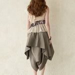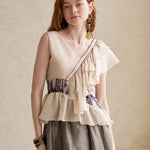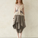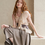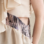 блузка без рукавов из шелка цвета шампанского, материал из серебристого шелка с едва заметным блеском. Несбалансированный дизайн в целом, например, рукава и талия. Окраска из органзы с леопардовым принтом. Вещь, которая достаточно привлекательна, чтобы носить её как отдельную блузку, и очень ценна для хранения.