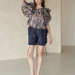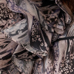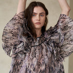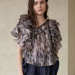фиолетовая шелковая блузка из шелковой органзы с леопардовым принтомПривлекательный дизайн с асимметричным V-образным вырезомЯркая модель с множеством расклешенных рукавовУкороченная длина визуально удлиняет ногиСвободный силуэт для комфортных движений