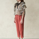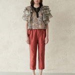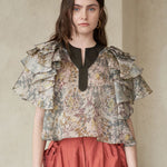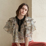 Блузка из шелка цвета хаки Материал из шелковой органзы Вырез Черный акцент Многослойные расклешенные рукава для гламурного образа Укороченная длина для визуального удлинения ног Свободный силуэт для комфортного движения