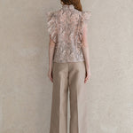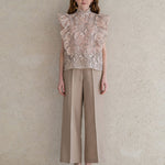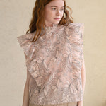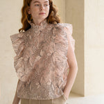 Безрукавная блузка светло-розового цвета. Детали с оборками и воротник-стойка придают женственность. Умный дизайн, который закрывает предплечья с оборками на плечах. Сзади молния, благодаря которой блузку удобно надевать. Свободный крой для комфортной посадки. Изделие выполнено из цветочного кружевного материала, который подчеркивает блузку.