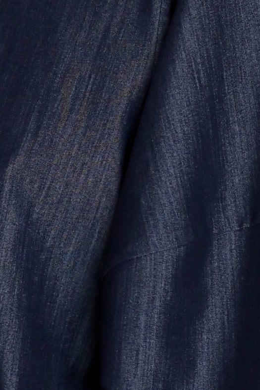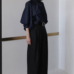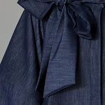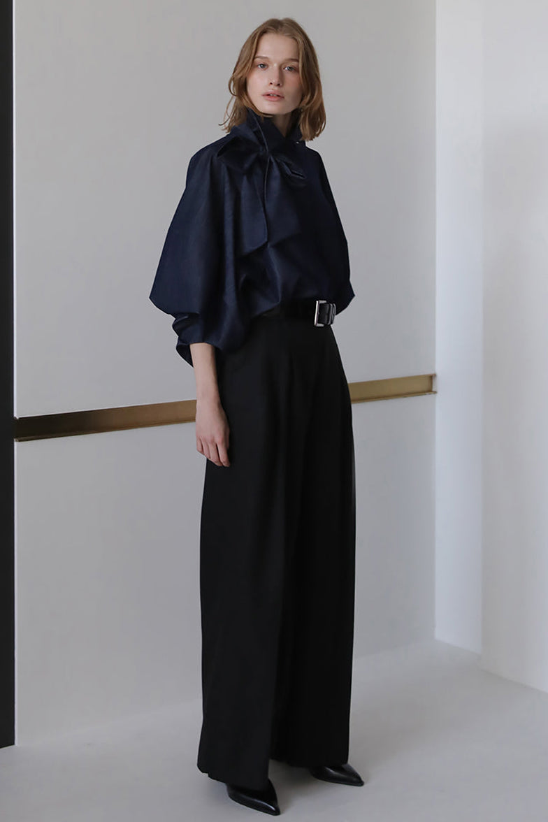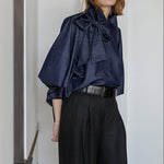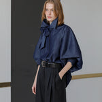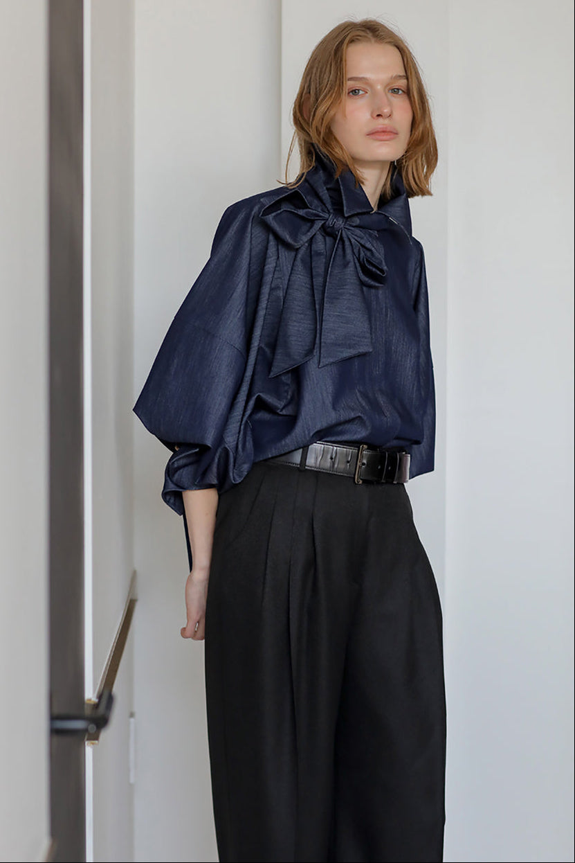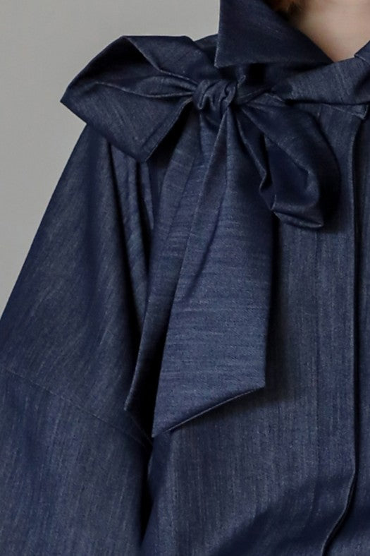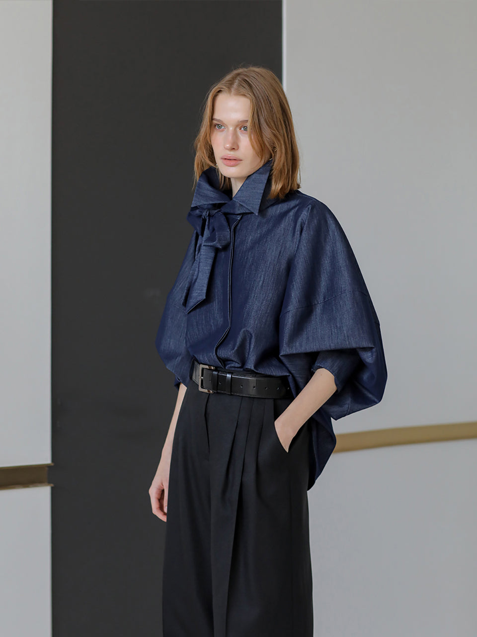 Джинсовая блузка с объемными рукавами и завязками на шее