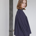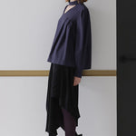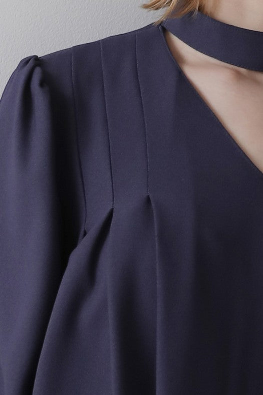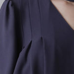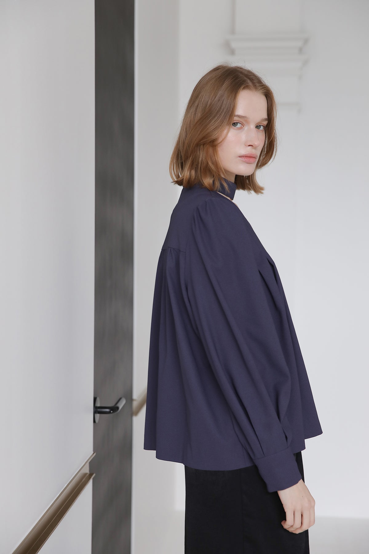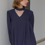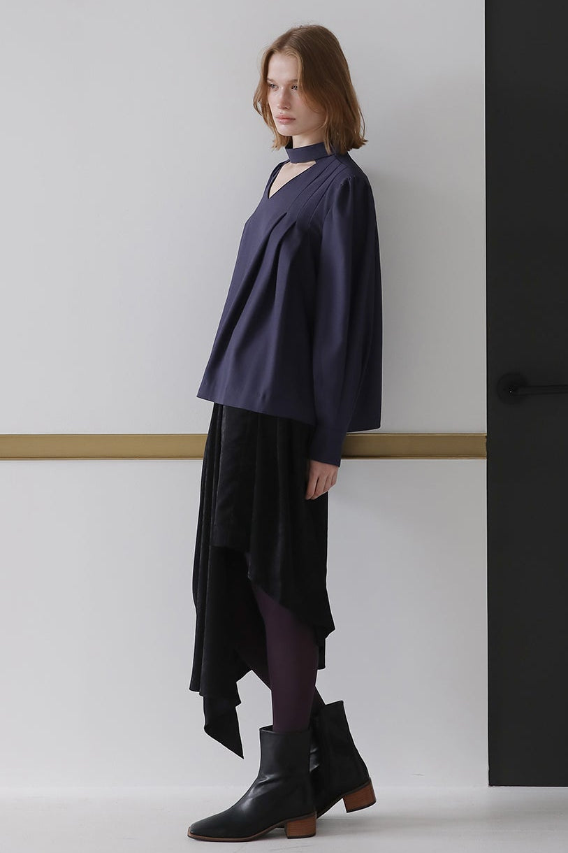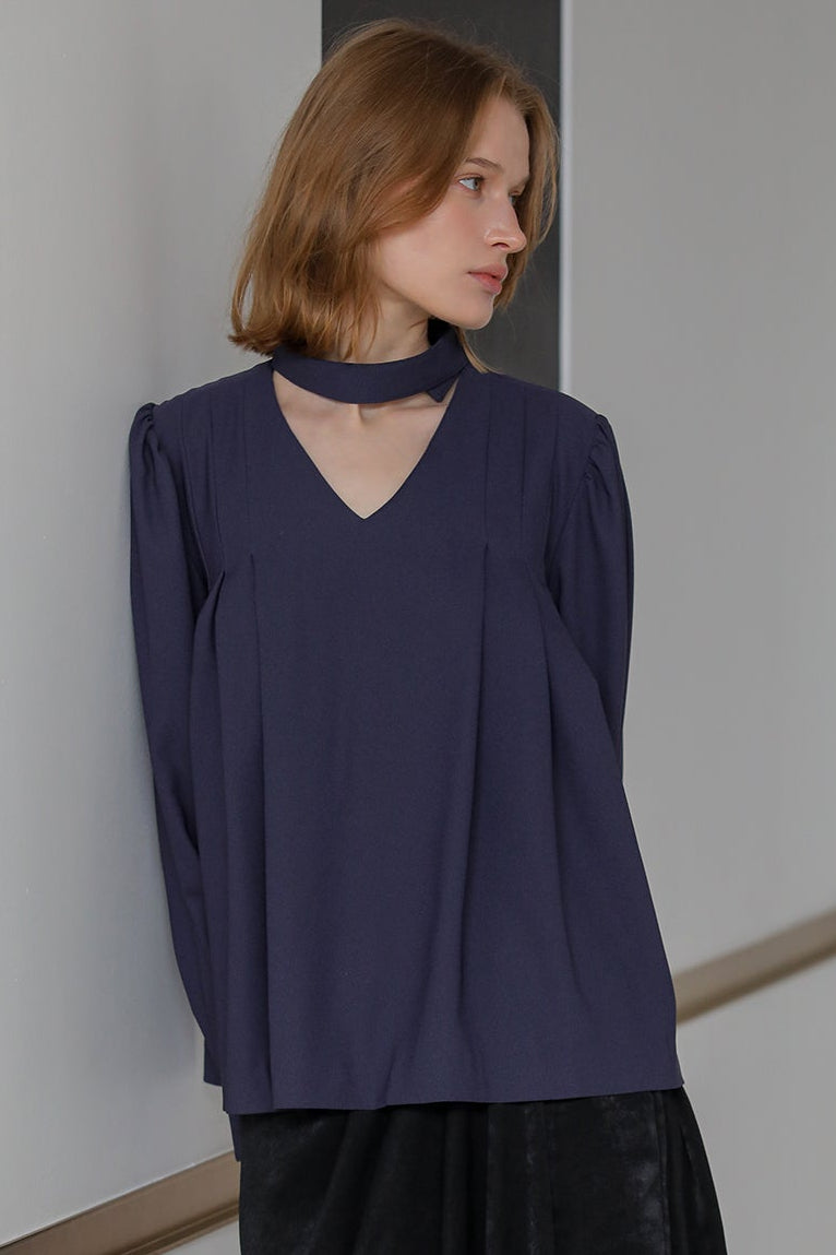 这款项圈设计的V领衬衫采用沉稳的紫蓝色。环绕颈部的项圈细节营造出性感的轮廓。肩部的褶皱设计自然增添了层次感。