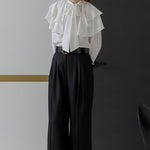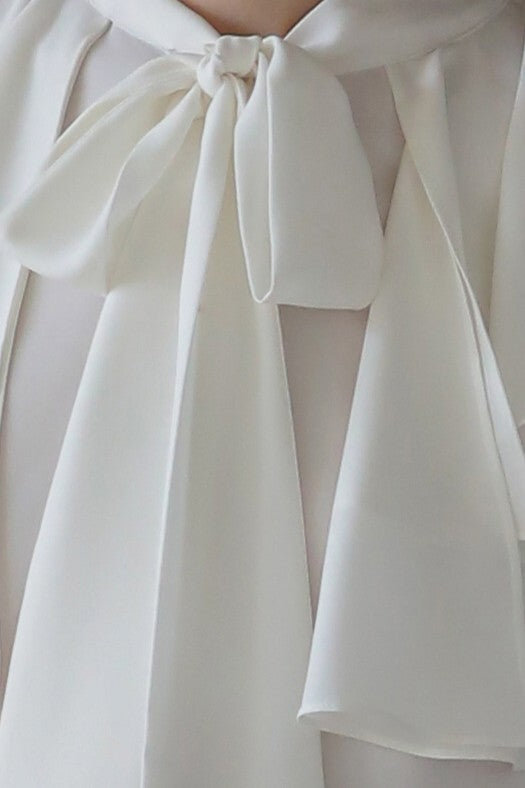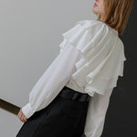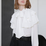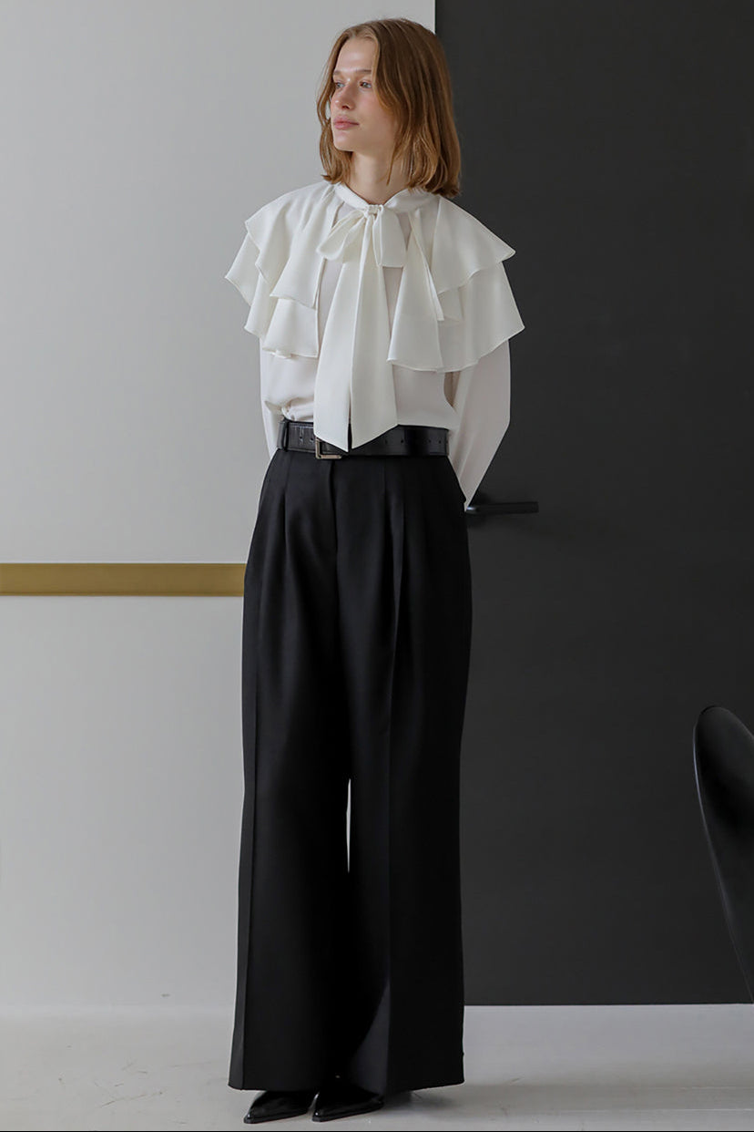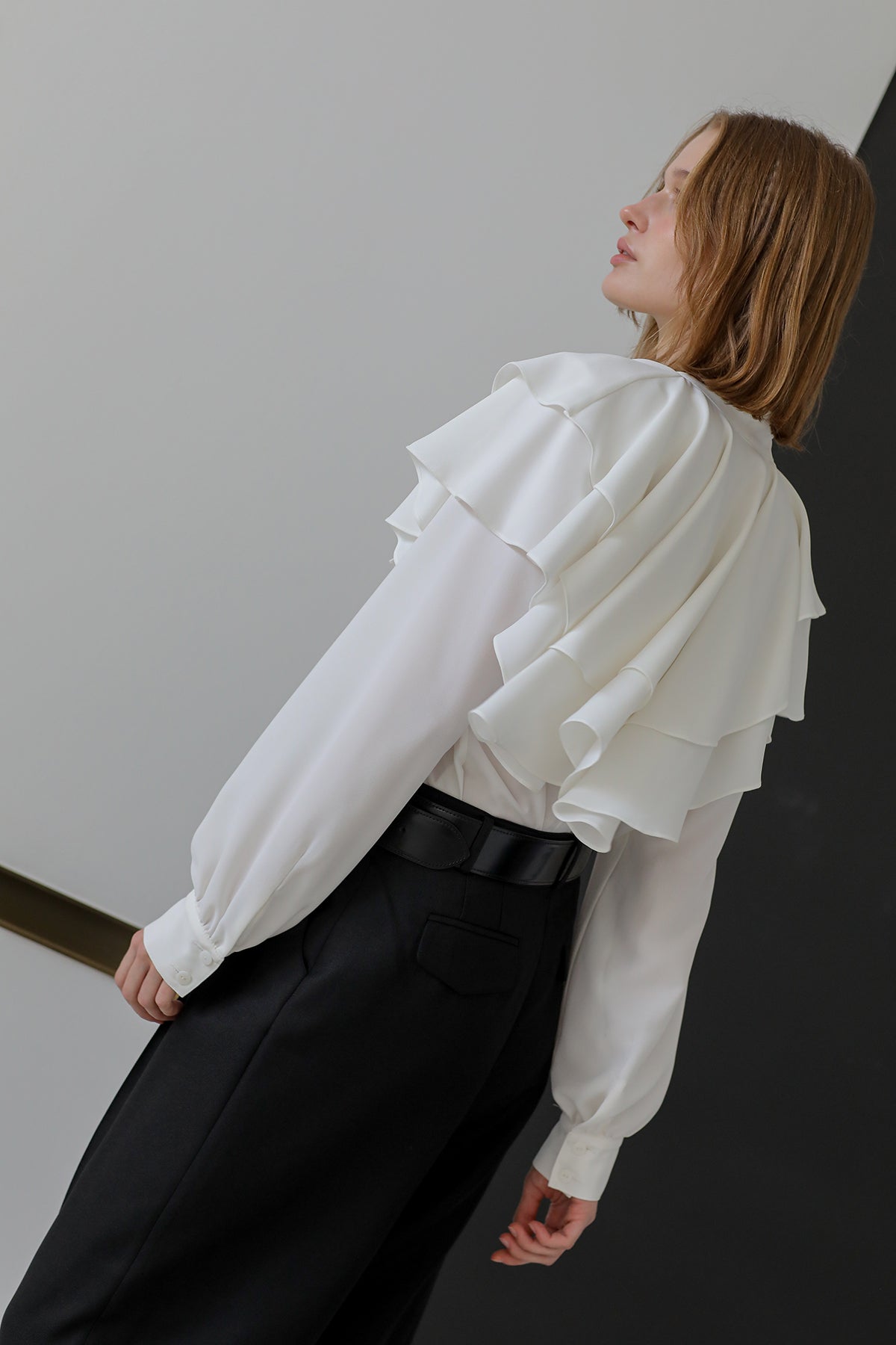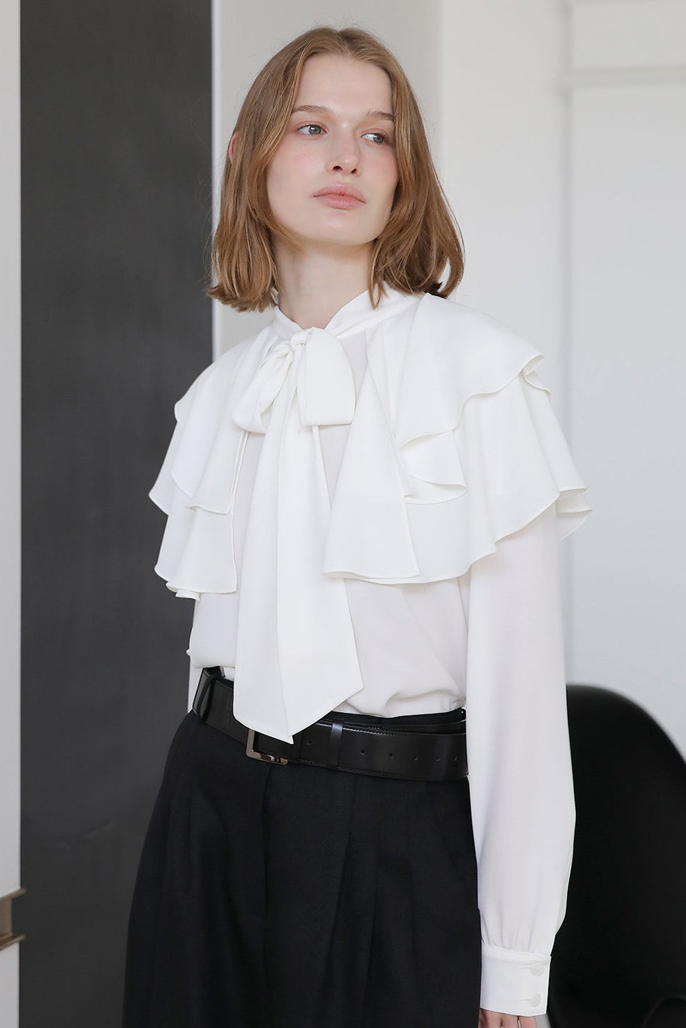 一款带有奢华荷叶边细节的女士衬衫。领口的丝带系带设计营造优雅的轮廓。轻盈柔软的聚酯材料提供出色的穿着感受。